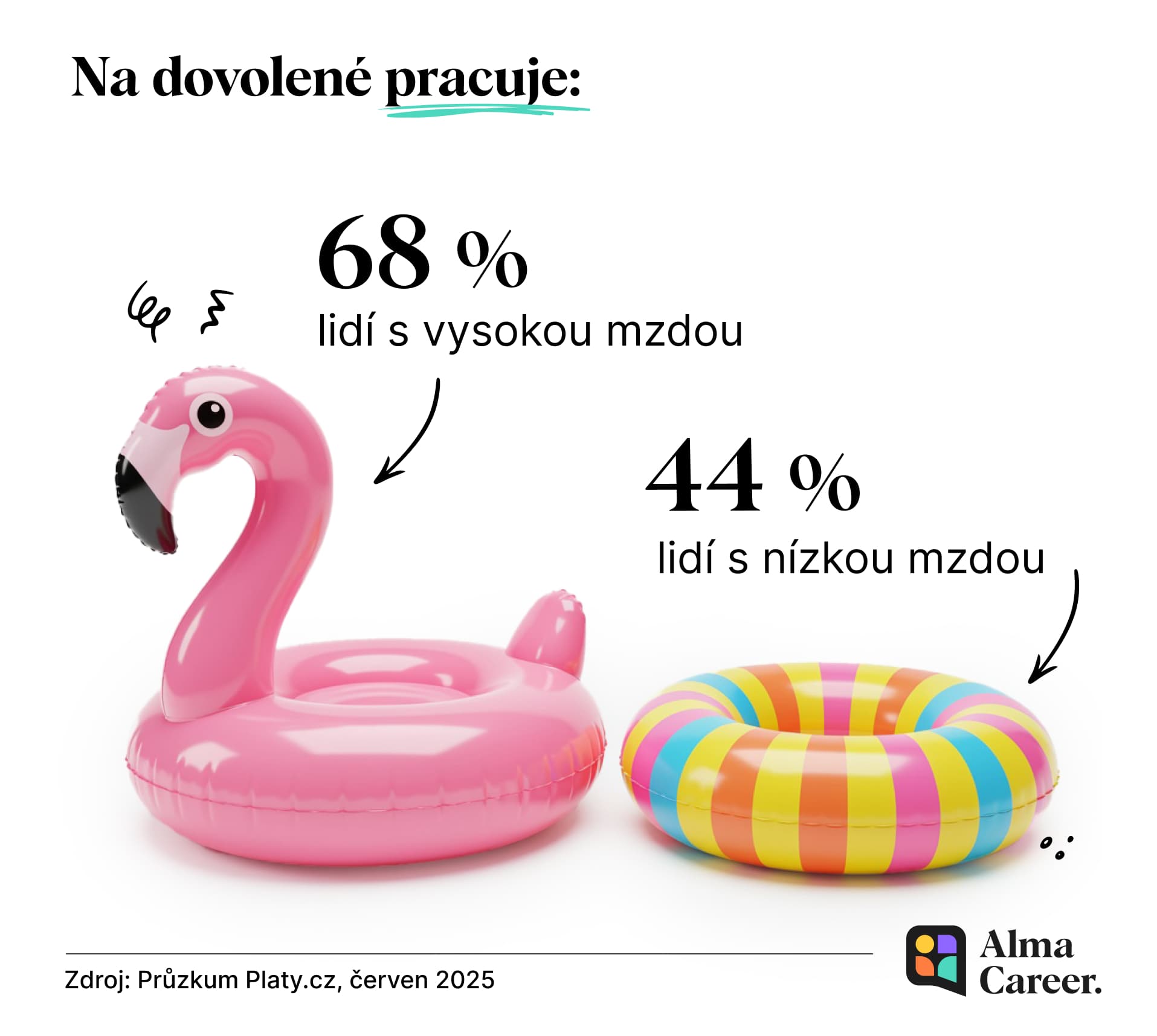 Důležité zjištění průzkumu Platy.cz je i v tom, kdo vlastně na dovolené pracuje. Výrazně častěji jsou to lidé s vyšší mzdou. Jen 10 % vrcholových manažerů u moře či na chalupě skutečně odpočívá a nepracuje. Je tu ale jeden paradox: právě lidé s vyšším příjmem častěji uvádějí, že se po dovolené cítí zrelaxovaní (91 % ku 75 % u lidí s nižší mzdou).