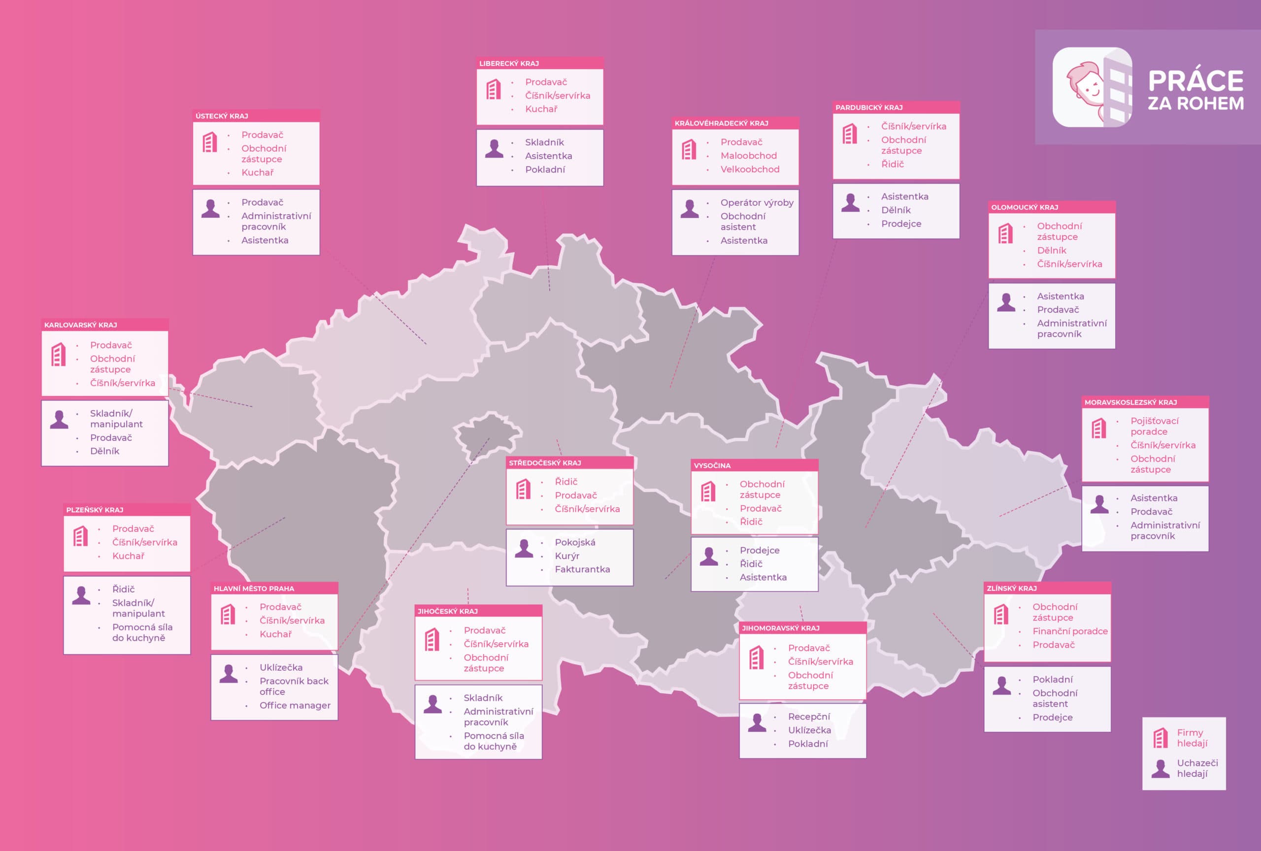 Firmy a uchazeči v Česku se od sebe vzdalují, jak ukazují aktuální data aplikace Práce za rohem publikovaná v nejnovějším čísle magazínu THE JOB, který sama vydává. Firmy hledají nejčastěji prodavače, číšníky a servírky, řidiče, kuchaře anebo obchodní zástupce. Uchazeči ale nejčastěji odpovídají na pozice asistentky, práci v úklidu či ve skladu. Mezi pěti nejvyhledávanějšími profesemi jsou z pohledu uchazečů ještě recepční a kurýr.