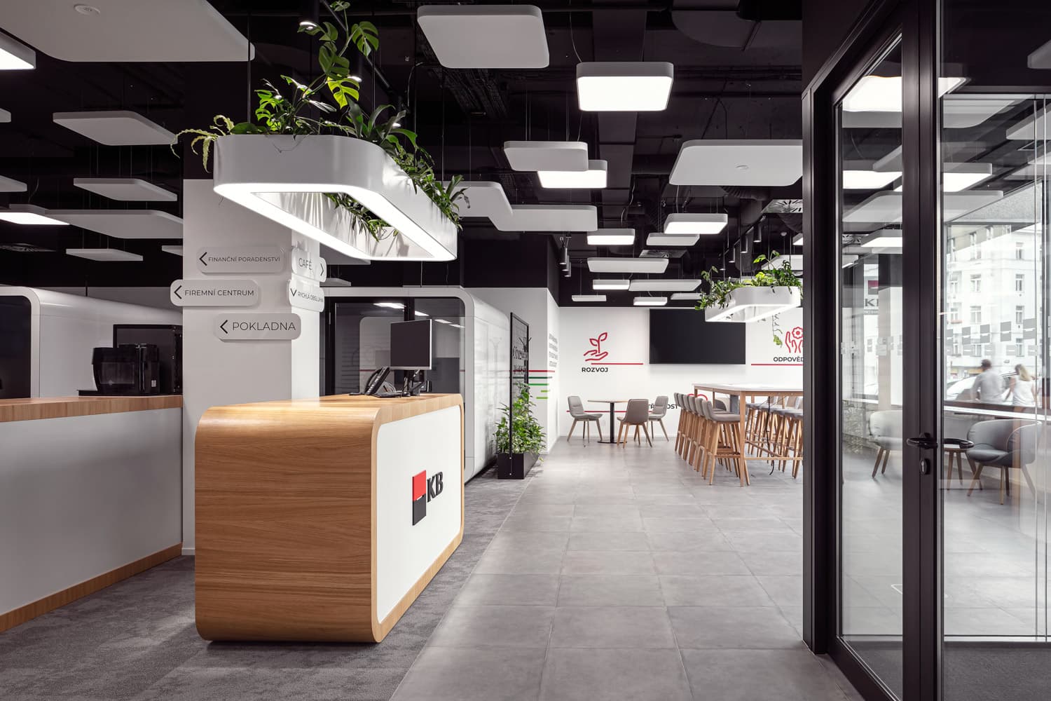 Mění se však také zázemí pro klienty. Svou Pobočku Budoucnosti, také od Studia Reaktor, má nově Komerční banka, jejíž interiérové řešení navazuje na virtuální prostředí mobilních telefonů a tabletů, z nichž je možné spravovat internetové bankovnictví.