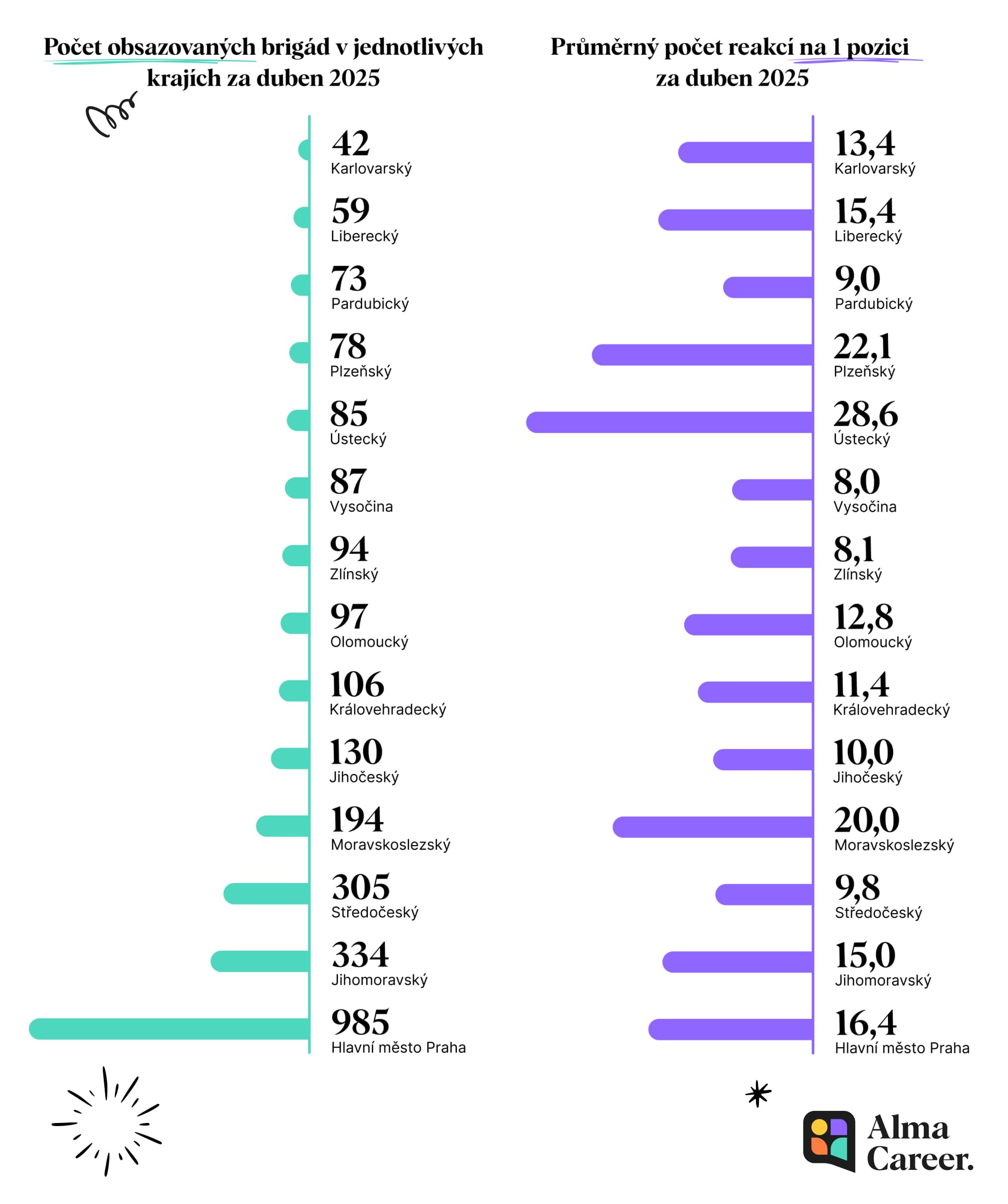 Přestože zájem uchazečů v dubnu 2025 ve srovnání s březnem mírně klesl (průměrný počet reakcí na inzerát z 21,6 na 14,6), celkový počet reakcí zůstává vysoký a očekává se jeho opětovný růst s nárůstem nabídky. Analýza průměrného počtu reakcí na jednu nabídku zároveň ukazuje, kde je pro uchazeče největší konkurence, a kde naopak firmy hůře shánějí lidi. V dubnu 2025 byl nejvyšší zájem ze strany uchazečů o brigády v Ústeckém kraji, kde na jednu nabídku připadlo v průměru 28,6 reakcí. Naopak nejnižší konkurenci zažili uchazeči ve Zlínském kraji s 8,1 reakcemi na nabídku, nebo na Vysočině (8,0). Mezi obory byl v březnu 2025 nejvyšší zájem o administrativu (28,4 reakcí/nabídka), v dubnu se čísla v oborech srovnala.