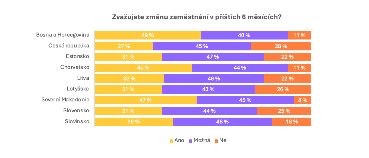 „Z šetření vyplývá, že se svou aktuální mzdou je spokojeno pouze 27 % respondentů, zatímco 56 % se cítí nedoceněných. Tento pocit je výraznější v baltských a balkánských zemích, zatímco lidé v Česku, na Slovensku a v Estonsku jsou s výší svých příjmů o něco spokojenější,“ komentuje výsledky Jozef Plško, ředitel PR a komunikace Alma Career, a dodává: „Když jsme se těch samých respondentů zeptali, zda zvažují změnu zaměstnání během následujících šesti měsíců, 77 % odpovědělo, že ano – což svědčí o široce rozšířené nespokojenosti. Opět platí, že ochota změnit zaměstnání je nejvyšší v balkánském regionu, kde dosahuje až 90 %. Tyto postoje přirozeně ovlivňuje celá řada faktorů – například aktuální úroveň mezd v porovnání s kupní silou.“