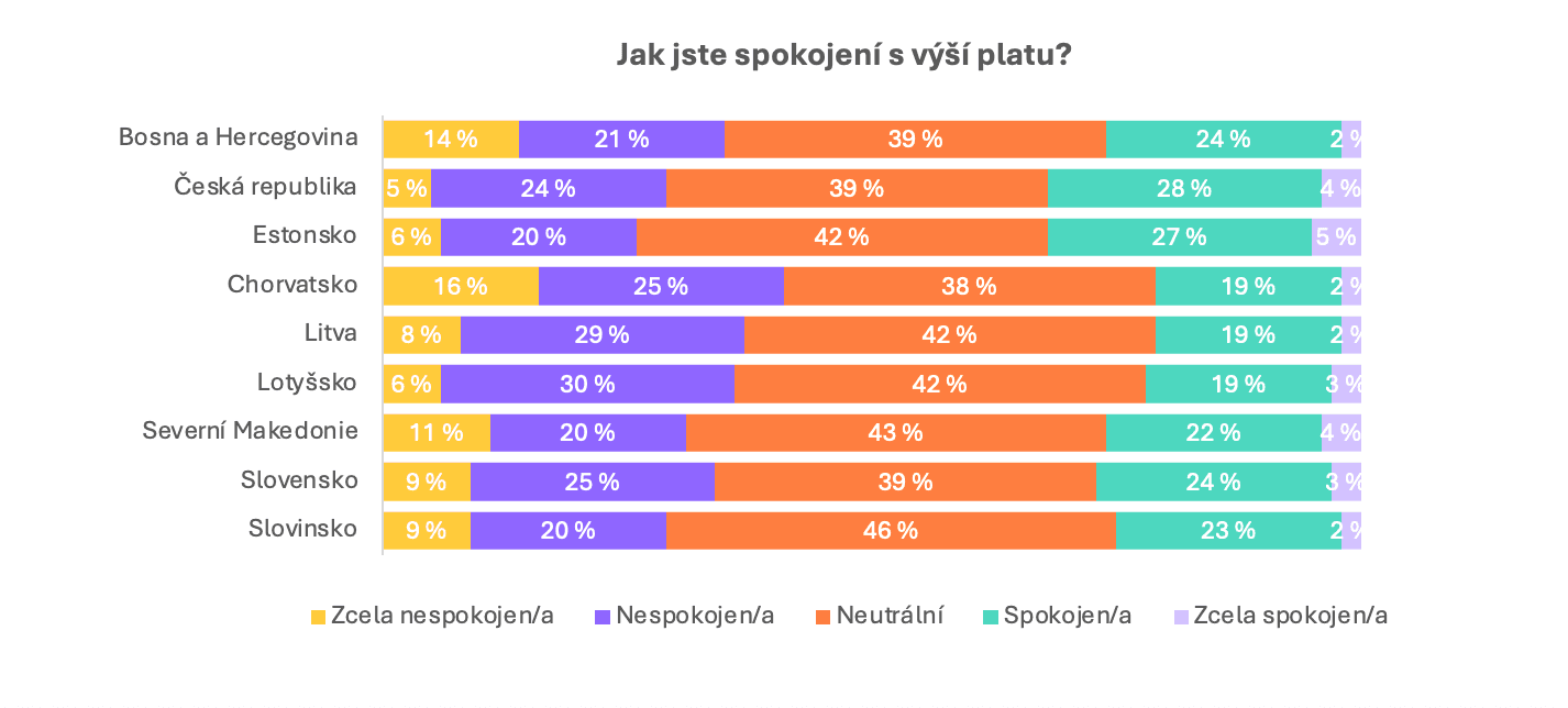 Šetření ukázalo rozdílnou míru spokojenosti s výší mzdy. Jen 27 % respondentů uvedlo, že jsou spokojeni, 33 % svou mzdu hodnotí negativně a 40 % má neutrální postoj. Ženy jsou se svou mzdou méně spokojené než muži – vyjádřilo se tak 24 % žen oproti 30 % mužů.