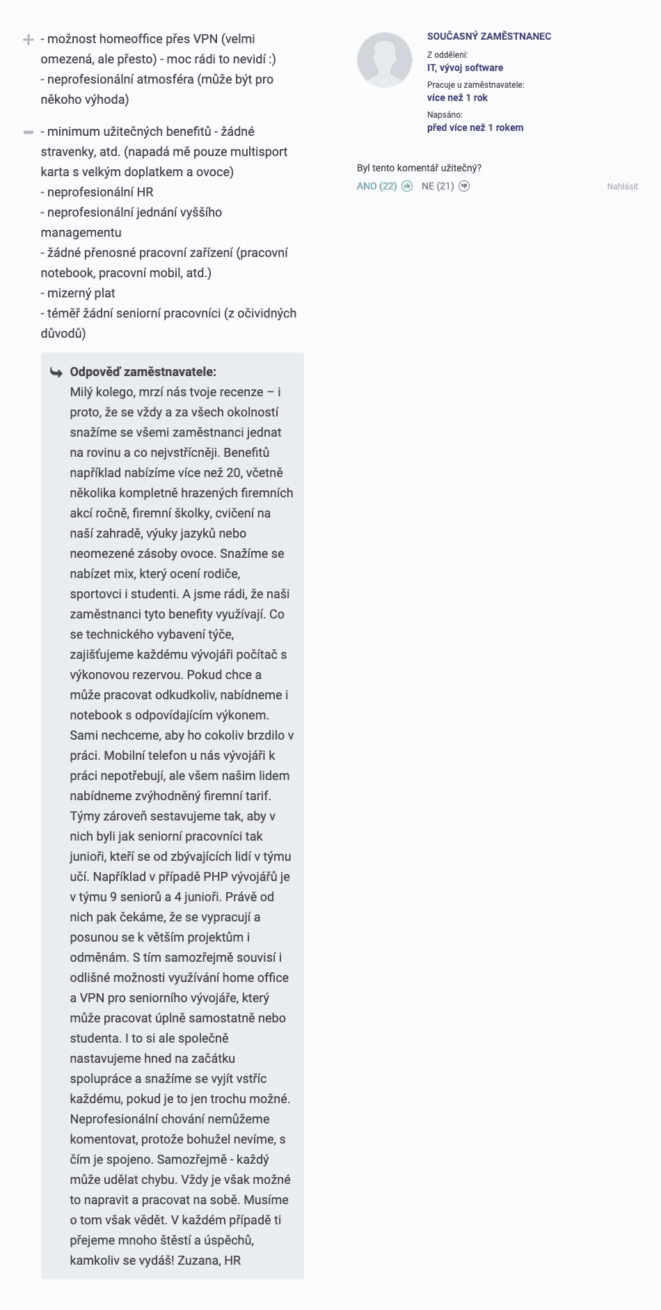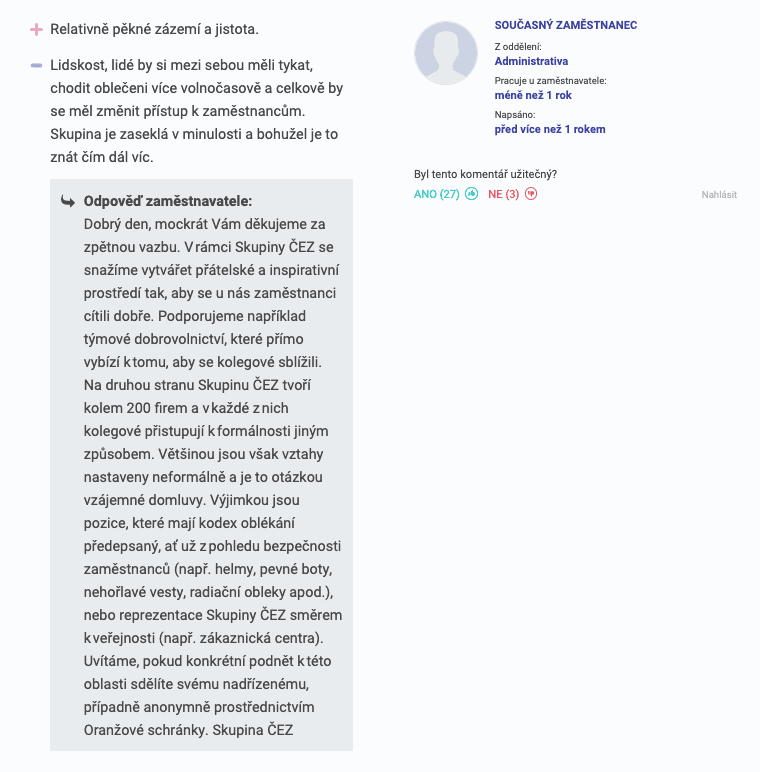 Nahlásit komentář můžete, když chcete dát zpětnou vazbu, že už jste na zmíněném problému zapracovali, když chcete komentář jakkoliv doplnit nebo třeba poděkovat za milé hodnocení. Nezapomeňte se pod vyjádření podepsat, například „Katka z HR“ – komentář je pak osobitější a věrohodnější.