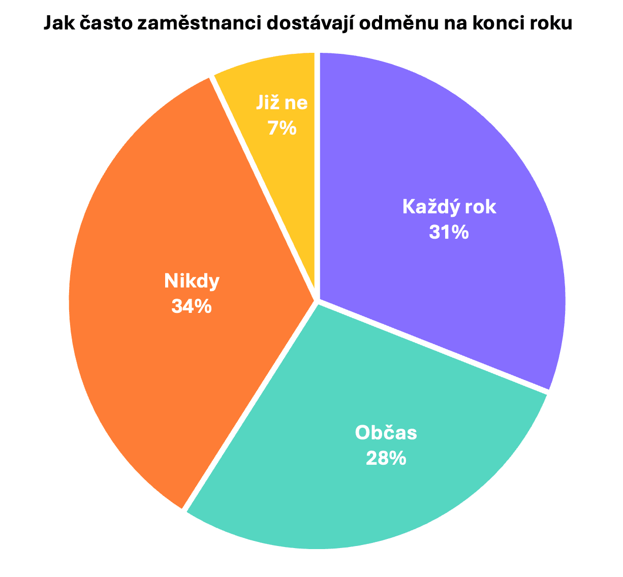 Na otázku, v jaké formě od zaměstnavatele odměnu na konci roku dostávají, odpovídali zaměstnanci nejčastěji, že jde o výkonnostní bonus. Mezi těmi, kdo nějakou odměnu na konci roku mají, tvoří výkonnostní bonus zhruba dvě třetiny odpovědí (67 %), přibližně čtvrtina (26 %) mluví o pevném 13. platu a 7 % dotázaných zmiňuje nefinanční formy, například poukázky, dárky nebo volno nad rámec dovolené. Z šetření je tak zřejmé, že české firmy se v oblasti odměn na konci roku nejčastěji spoléhají na výkonnostní bonusy navázané na ekonomické výsledky.