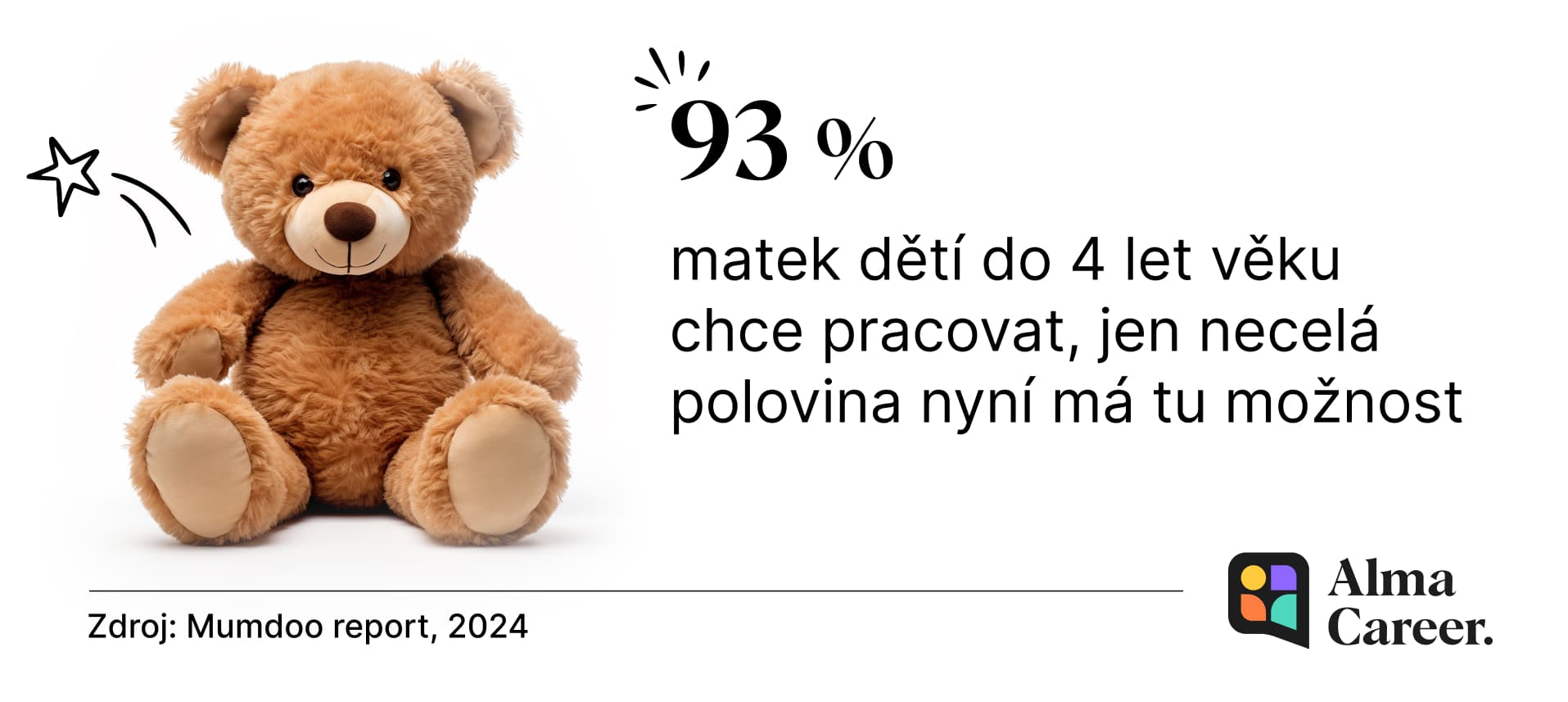Většina maminek chce pracovat, jen 13 % ale na plný úvazek. Zbytek by ocenil práci na částečný úvazek. Alarmující je, že 48 % matek malých dětí nepracuje vůbec a trh tím přichází o jejich zájem a schopnosti. Většina z nich by přitom pracovat chtěla.