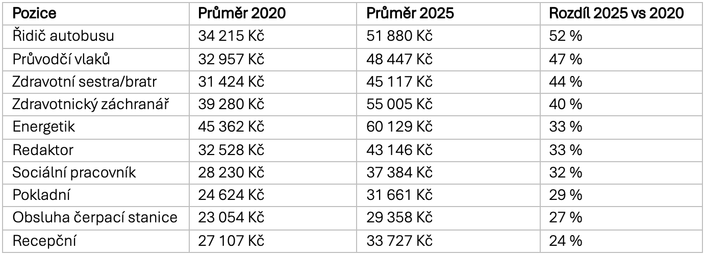 Vývoj průměrné celkové mzdy 2020 vs. 2025 u vybraných profesí