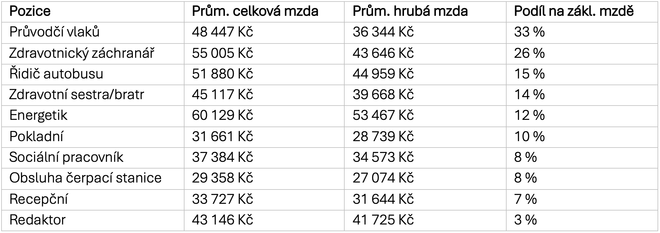 Analýza Platy.cz porovnává základní a celkovou mzdu, která už zahrnuje příplatky, odměny a další složky. U vybraných profesí, které typicky pracují i během svátků, vychází průměrný příplatek zhruba na 10 % základní mzdy. Největší rozdíl mezi základní a celkovou mzdou mají podle dat průvodčí vlaků, zdravotničtí záchranáři a řidiči autobusů. „U průvodčích vlaků se celková mzda zvyšuje v průměru o třetinu oproti základní mzdě, u zdravotnických záchranářů zhruba o čtvrtinu. Přibližně 15 % navíc získávají řidiči autobusů. Na druhém konci žebříčku jsou redaktoři, u nichž podíl příplatků a odměn činí v průměru jen tři procenta,“ doplňuje Miroslav Dravecký.