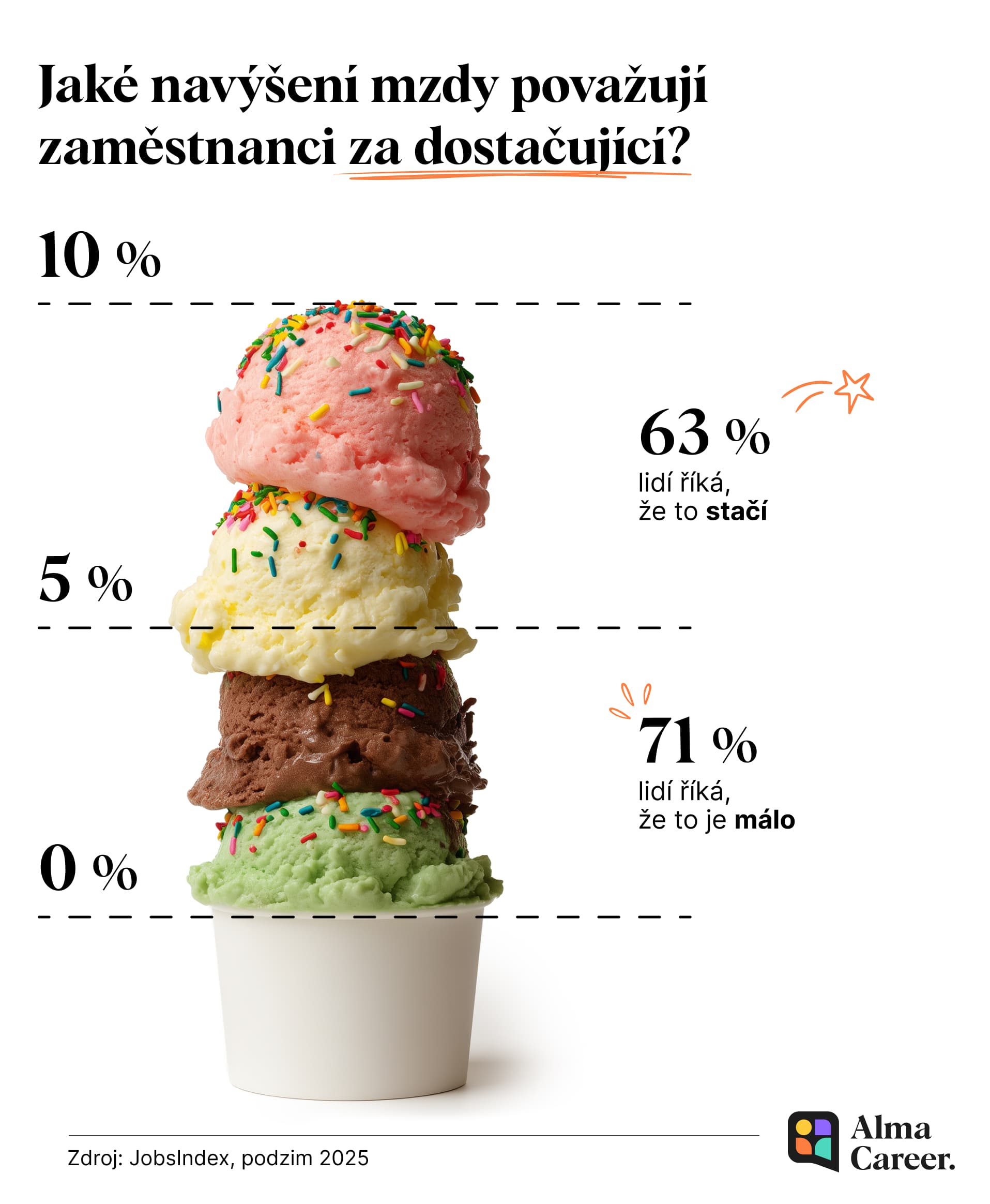 Podle aktuální podzimní vlny průzkumu JobsIndex očekává na počátku roku 2026 zvýšení své mzdy plných 35 % zaměstnanců, dalších 29 % to nevylučuje. Většinou (pro 57 % z nich) očekávají nárůst mzdy do 5 %. Což je ale podle lidí málo, 71 % z nich považuje tento růst – i vzhledem k předchozí dlouhodobě špatné situaci – za nedostatečný.