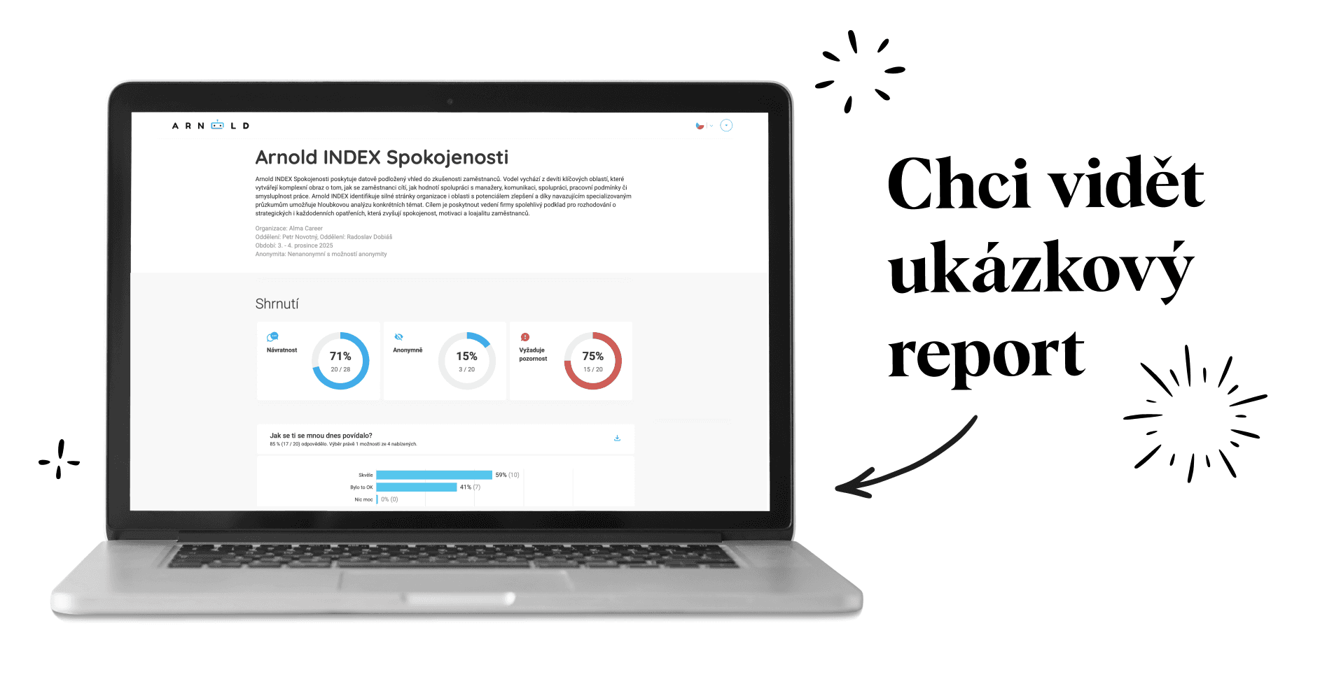Proto jsme to postavili jinak: Arnold je konverzační průzkum ve formě krátkého rozhovoru, většinou na 3–5 minut podle tématu. Umí automaticky generovat přehledné reporty pro manažery i HR, aby se s výsledky dalo pracovat rychle a konkrétně – co funguje, co nefunguje, kde je problém v týmu, kde napříč firmou.