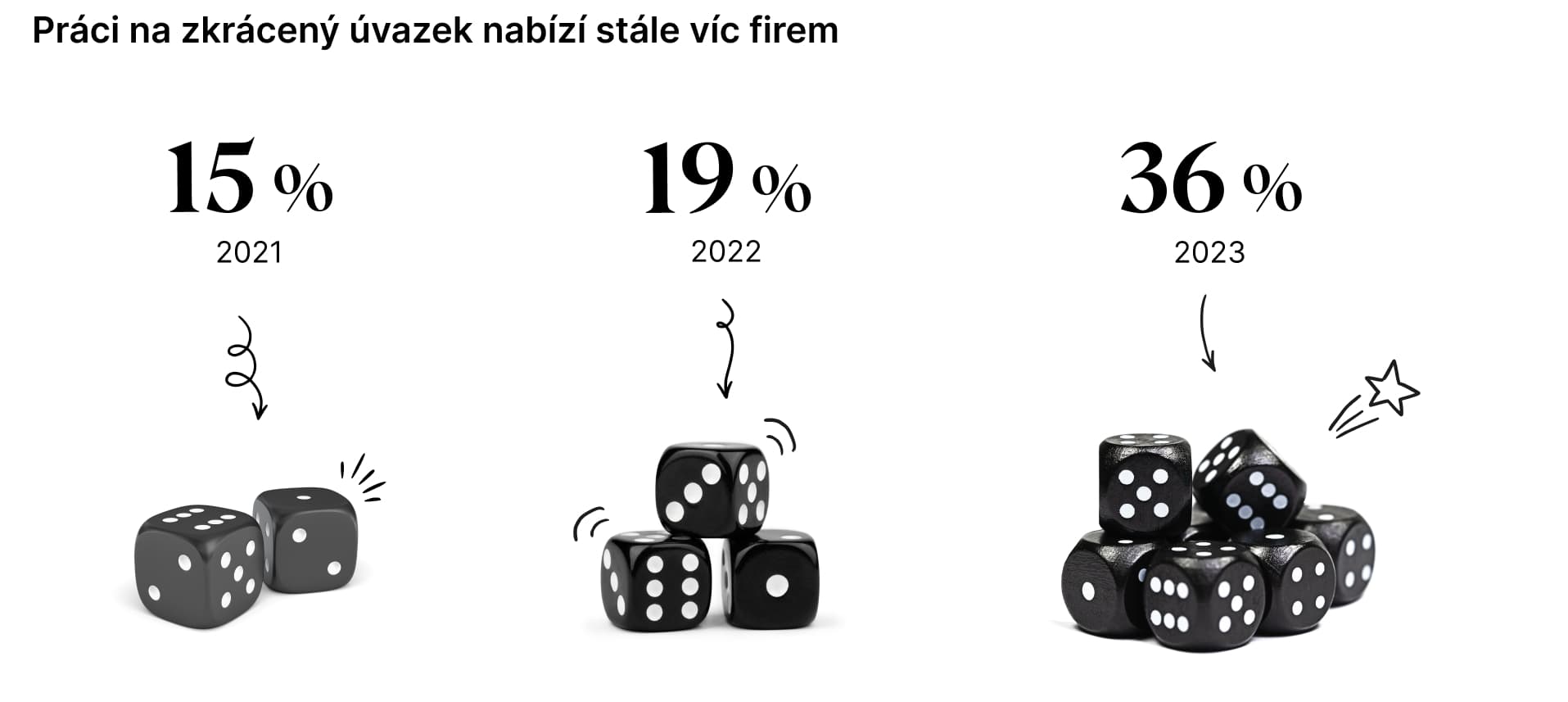 Z firem, které hledají nové pracovníky, jich částečné úvazky nabízí 36 %. To je skoro dvakrát víc než rok předtím. A to aniž by výrazně klesly stále dominantní plné úvazky (láká na ně 90 % firem). Navíc změny podmínek u DPP a DPČ můžou nabídku částečných úvazků dál rozšířit.