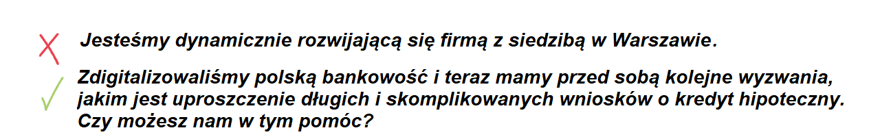 Podobnie jak w przypadku nazwy stanowiska, postaraj się wywołać emocje u kandydata w nagłówku. Możesz sprzedać historię swojej firmy lub podzielić się tym, dlaczego w pierwszej kolejności szukasz nowego współpracownika. A jeśli chcesz mówić o firmie jako całości, skup się głównie na przyszłości, na wizjach i planach. Przeszłość i wieloletnie tradycje nie interesują kandydatów tak bardzo, bo w przeciwieństwie do przyszłości, nie mogą już być jej częścią.