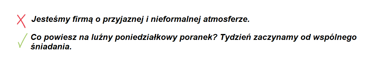 Każdy typ kandydata jest naturalnie zainteresowany czymś innym. Dla marketerów może to być marka, dla której będą pracować, dla pracowników fizycznych może to być to, czy będą pracować na dwie czy trzy zmiany. Jeśli rekrutujesz na różne stanowiska, stwórz różne atuty dla różnych branż. Ma to na celu nie tylko przedstawienie firmy, ale także zainteresowanie kandydata czytaniem dalej.