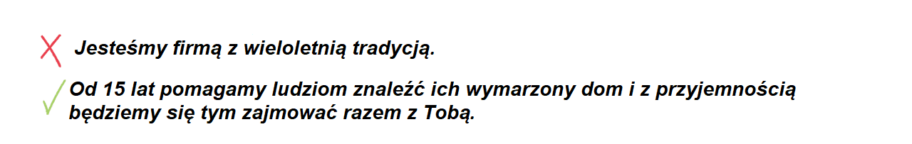 Frazy takie jak "dynamiczna firma" czy "długa tradycja" to dziś banały. Wyróżnij się wśród pozostałych i opisz swoją firmę po ludzku, prosto i bez formalnych zwrotów. Jeśli chcesz, aby Twoja firma sprawiała wrażenie poważnej, nie oznacza to, że musisz uciekać się do sztucznych i nienaturalnych zwrotów. Nawet poważny ton można wykorzystać, aby brzmiał naturalnie.