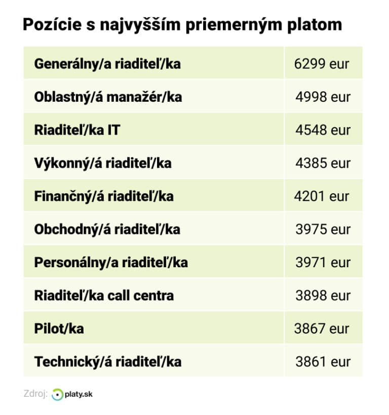 Najviac na Slovensku zarábajú zamestnanci a zamestnankyne v oblasti vrcholového manažmentu. Až osem najlepšie platených pozícií je práve z tejto oblasti. Najviac si mesačne prilepšia generálni riaditelia a riaditeľky, ktorých priemerný mesačný plat je tento rok takmer 6300 eur. Tento rok bolo na Profesia.sk zverejnených zatiaľ 81 pracovných ponúk na túto pozíciu, polovica z nich v Bratislavskom kraji. Regionálne rozdiely sú výrazné aj v prípade generálnych riaditeľov, medzi priemerným platom v Bratislavskom kraji (6973 eur) a v Prešovskom (5153 eur) je takmer 2-tisícový rozdiel.