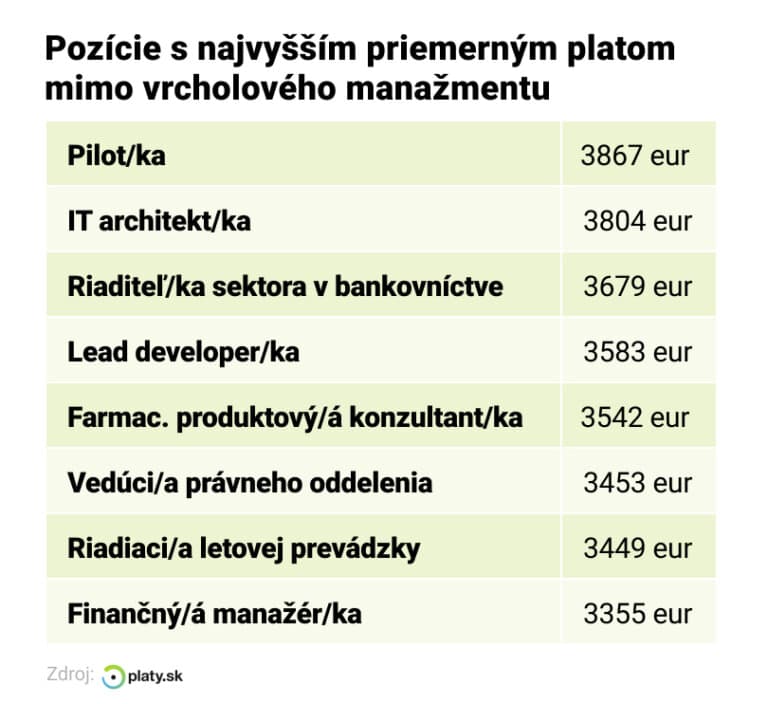 Aj mimo vrcholového manažmentu si však vedia Slováci a Slovenky nadštandardne zarobiť. IT architekti a architektky majú takmer rovnaké platy ako technickí riaditelia. Vyše 3600 eur mesačne v priemere zarobia riaditelia a riaditeľky sektora v bankovníctve. Medzi desať najlepšie platených profesií mimo vrcholového manažmentu patria aj riadiaci letovej prevádzky s takmer 3500 eurami mesačne či finanční manažéri s vyše 3300 eurami.