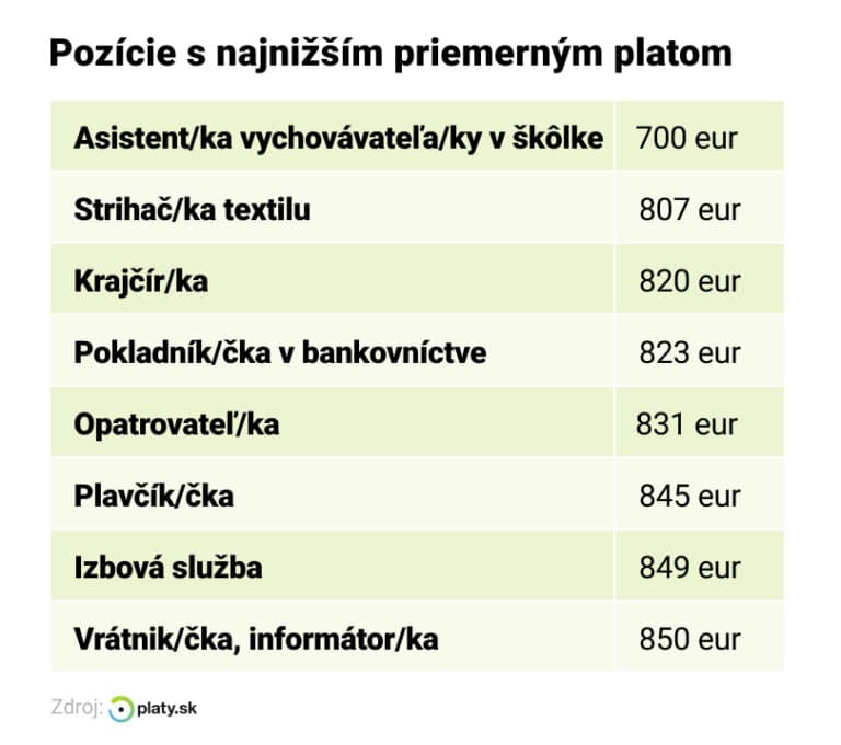 Na opačnej strane platového rebríčka sú zamestnanci najmä z oblastí textilného priemyslu a cestovného ruchu, no najmenej, na úrovni minimálnej mzdy, zarábajú asistenti a asistentky vychovávateliek v škôlke. 807 eur mesačne zarábajú v priemere strihači a strihačky textilu, len o 13 eur viac majú krajčíri a krajčírky. Menej ako 850 eur mesačne zarábajú aj vrátnici, izbová služba či opatrovateľky a osobné asistentky.