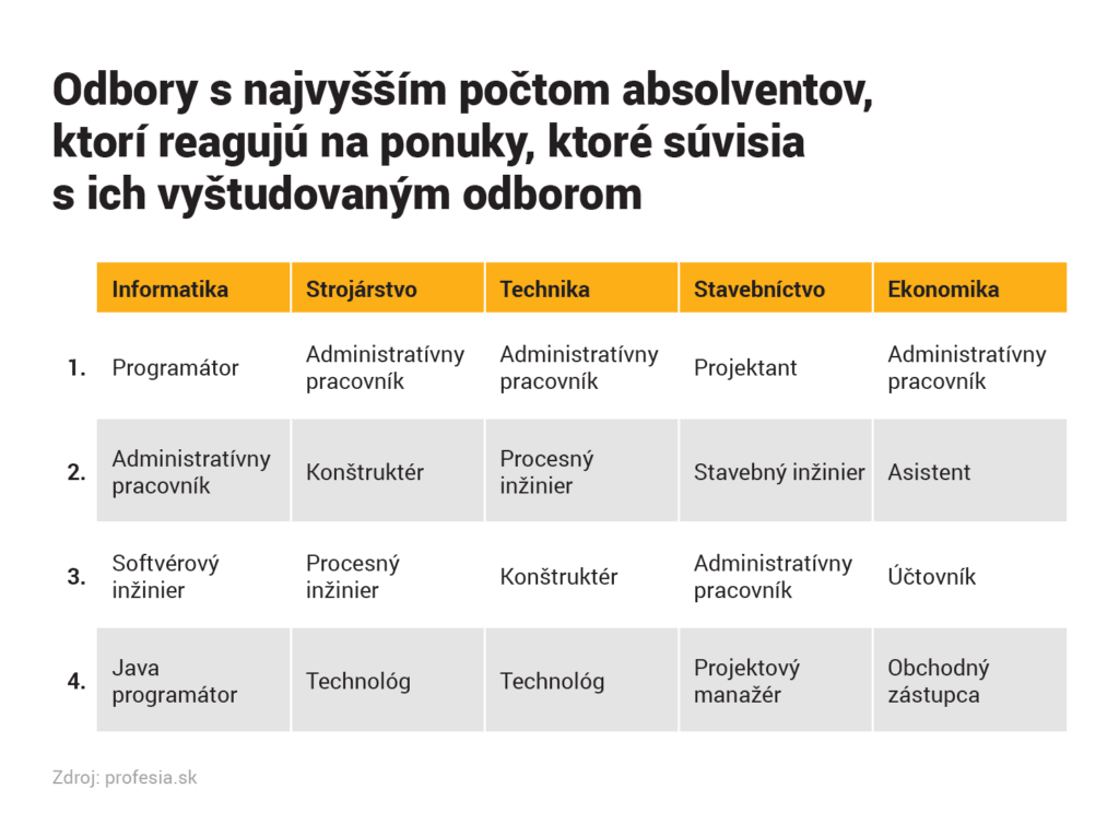 Analýza pracovného portálu Profesia.sk ukázala, že absolventi informatiky najčastejšie spomedzi všetkých reagujú na pracovné ponuky, ktoré súvisia s odborom, ktorý vyštudovali. Hlásia sa na pozície programátorov, softvérových inžinierov či Java programátorov. Absolventi strojárstva a techniky síce podľa dát portálu Profesia.sk najviac reagujú na ponuky na pozície administratívnych pracovníkov, no potom nasledujú pozície s ich špecializáciou. Najčastejšie sa uchádzajú o prácu konštruktéra či procesného inžiniera.