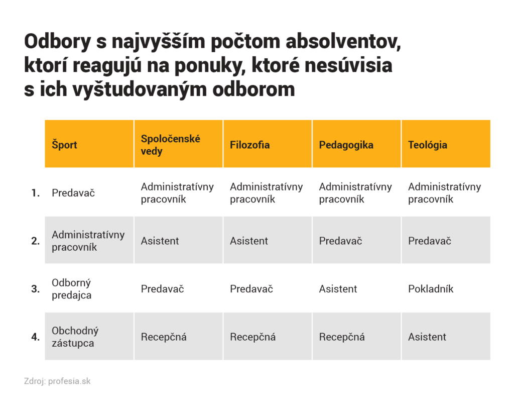 Úplne opačne konajú po úspešnom ukončení štúdia absolventi teológie, pedagogiky či spoločenských vied. Najčastejšie reagujú na ponuky, ktoré s odborom, ktorý vyštudovali, vôbec nesúvisia a majú nižšie požiadavky na kvalifikáciu – ide o pozície administratívnych pracovníkov a referentov. Často sa uchádzajú aj o prácu predavačov, pokladníkov, asistentov či recepčných.