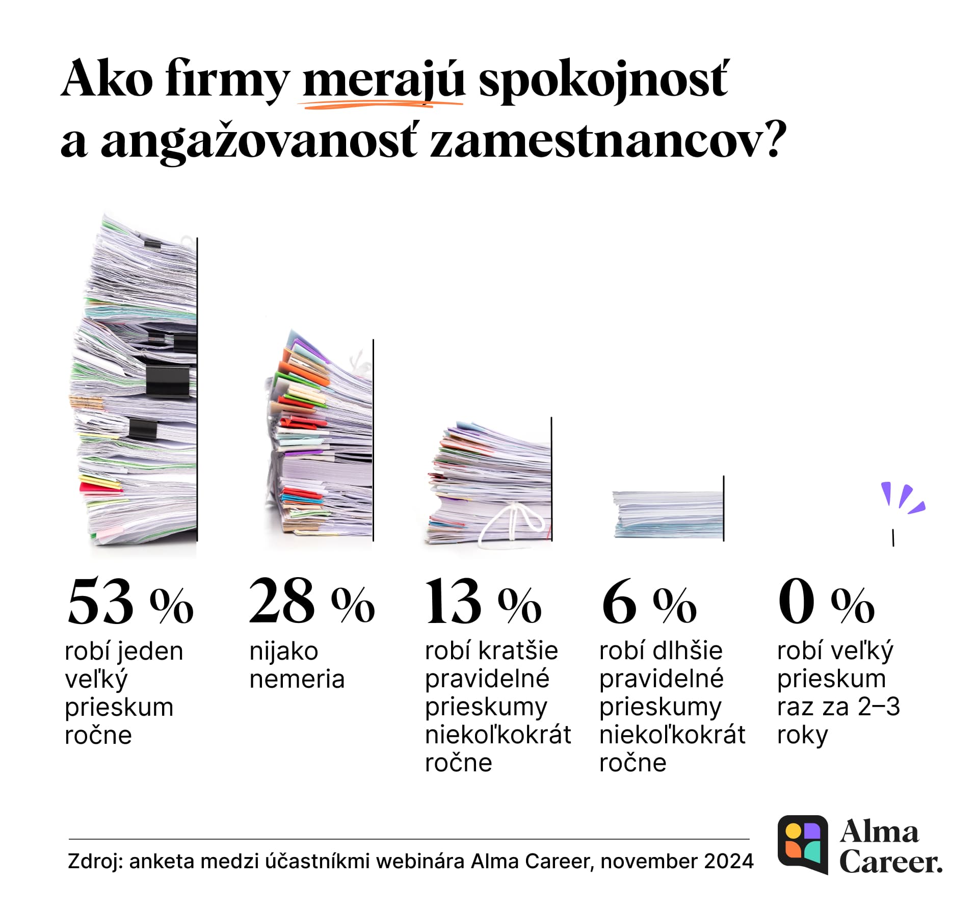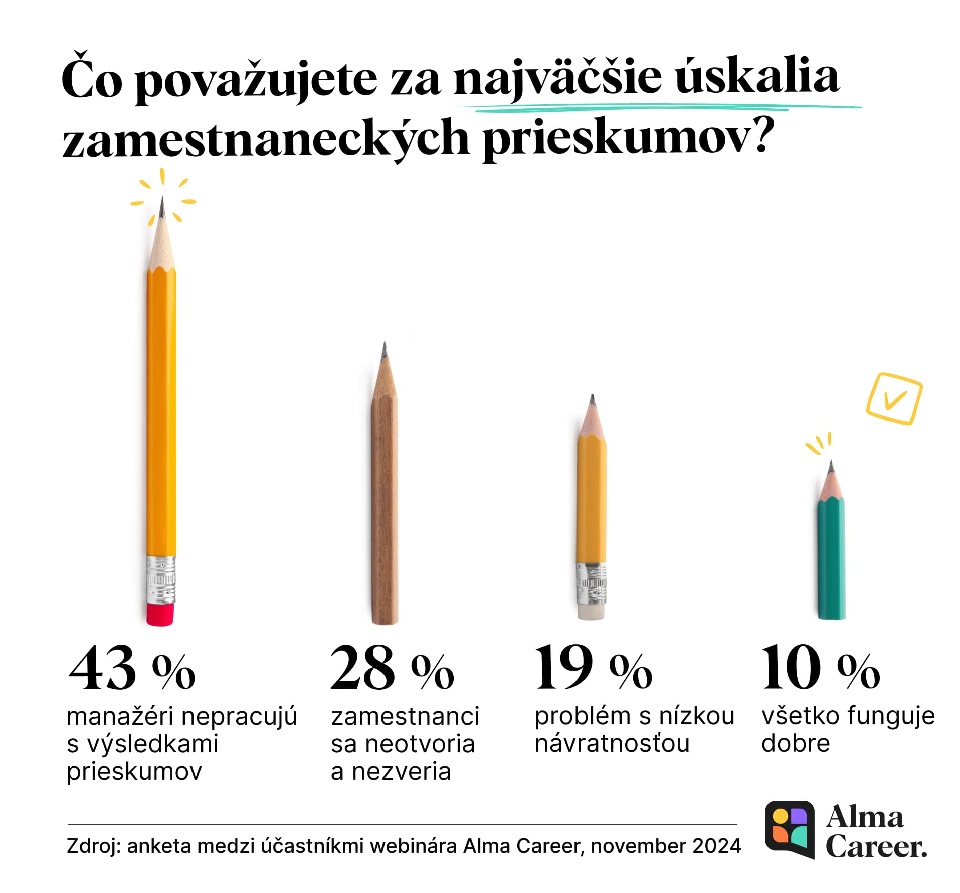 Prieskumy medzi zamestnancami umožňujú získať cennú spätnú väzbu – ukazujú, čo ľudia oceňujú a čo ich trápi. Pomáhajú včas odhaliť ohnisko vznikajúceho problému, sledovať trendy a porovnávať výsledky. Vďaka nim môžete prijímať opatrenia, ktoré pomôžu udržať vašu firmu vo forme.