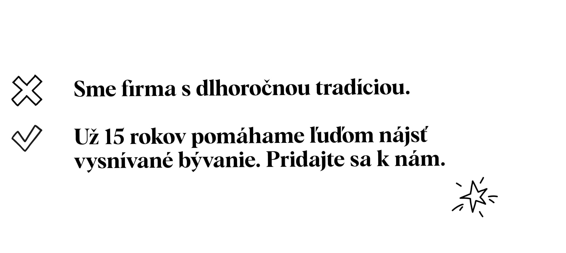 Slovné spojenia typu „dynamicky sa rozvíjajúca spoločnosť“ alebo „dlhoročná tradícia“ sú už v dnešnej dobe klišé. Vyniknite a opíšte svoju firmu jednoducho, ľudsky a bez formálnych fráz. Ak chcete, aby vaša firma pôsobila seriózne, neznamená to, že sa musíte uchýliť k umelým a neprirodzeným vetám. Aj vážny tón je možné použiť takým spôsobom, aby znel prirodzene.