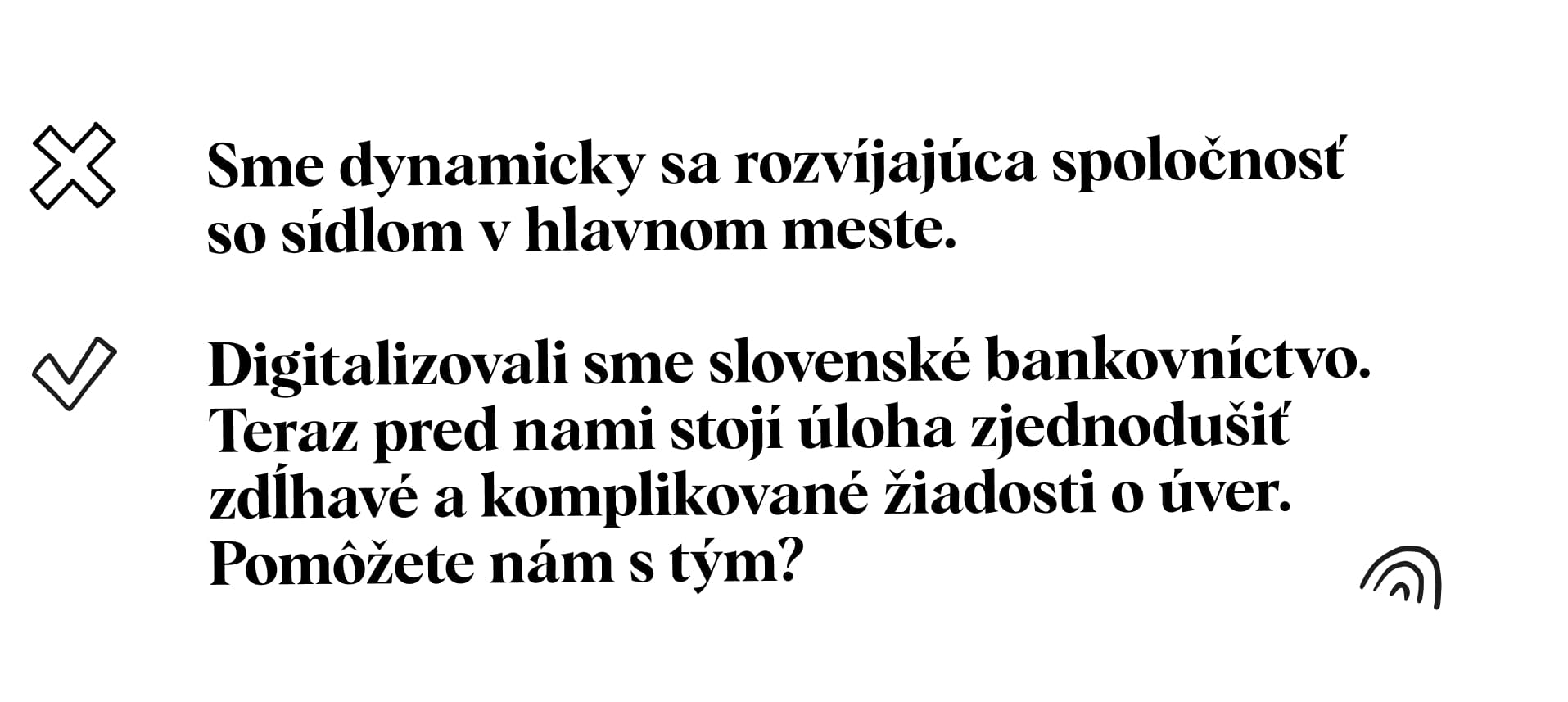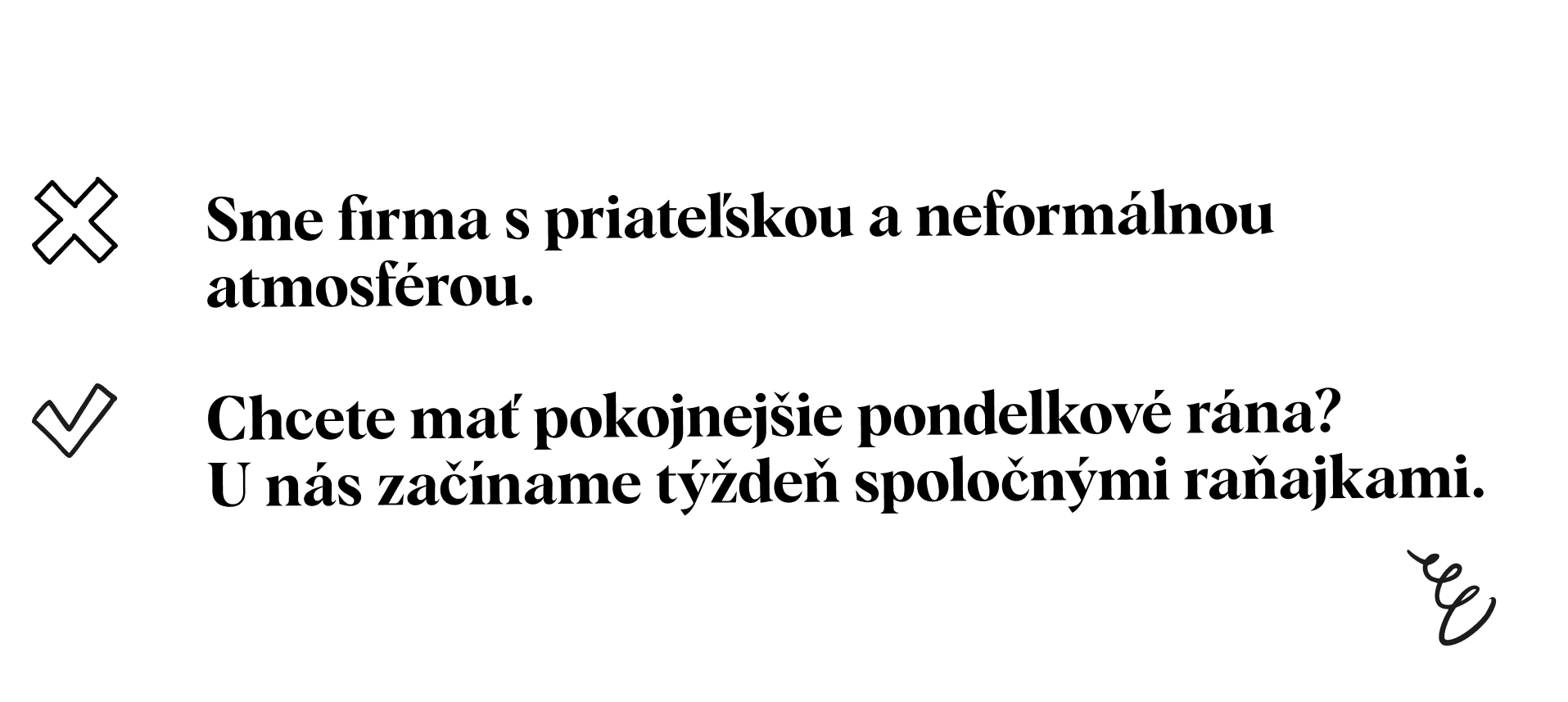 S čitateľom dokážete naviazať pevnejší vzťah, keď ho budete oslovovať osobne. Frázy typu „Vhodný uchádzač by mal byť spoľahlivý…“ spomínajú niekoho nekonkrétneho, pôsobia príliš formálne a od inzerátu skôr odradia. Text bude oveľa svižnejší a osobnejší, ak kandidáta oslovíte napríklad otázkou „Dá sa na vás spoľahnúť a viete si postrážiť termíny?“. Stále však treba mať na pamäti, že perex inzerátu slúži predovšetkým ako úvod. Na vymenovanie všetkých vašich požiadaviek na pracovníka máte samostatnú časť.
