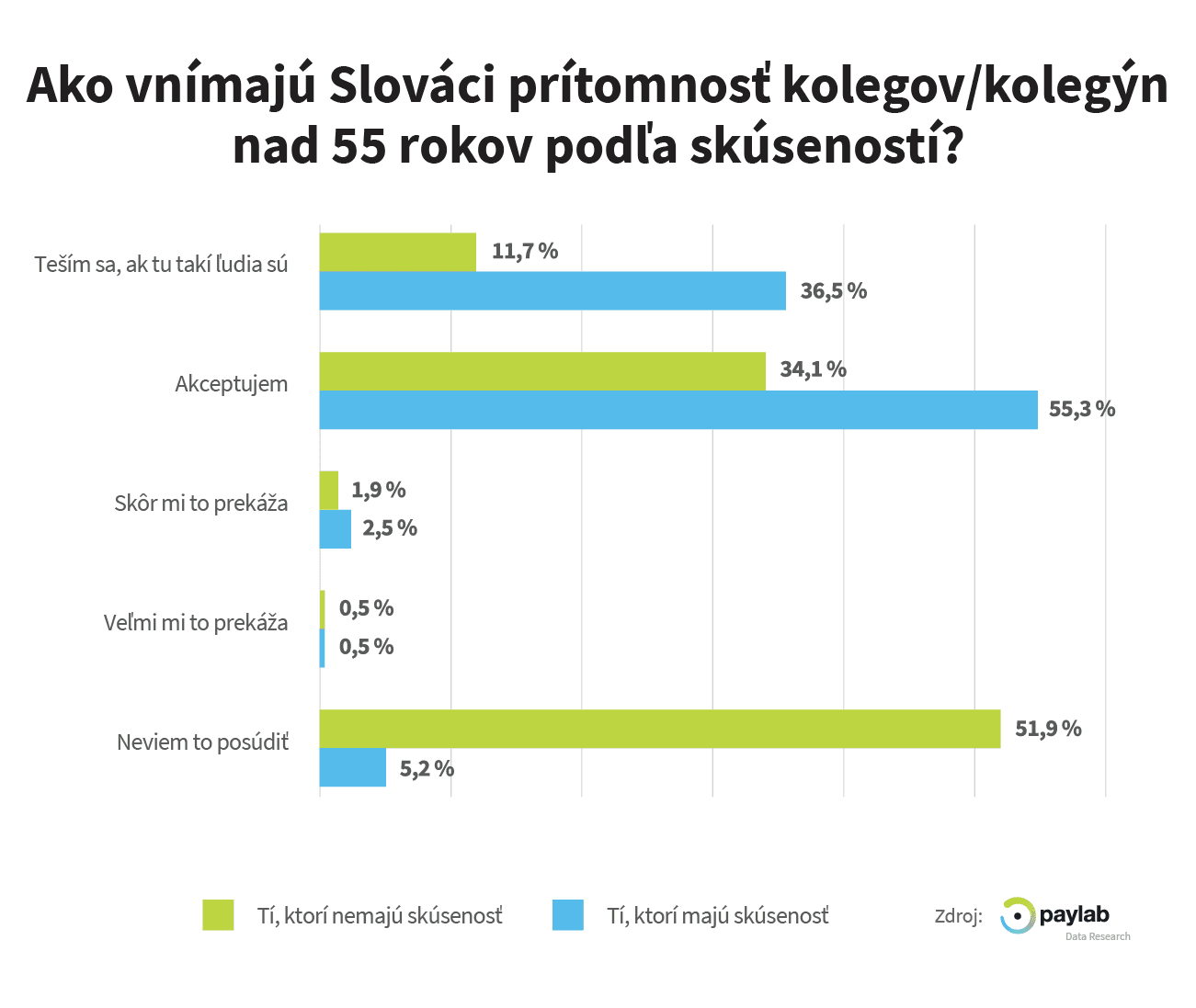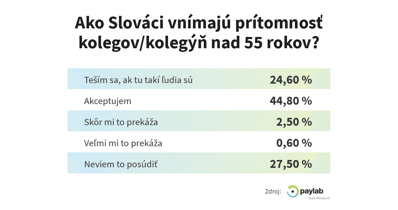 Paylab Data Research zisťoval, aké sú postoje Slovákov voči spolupráci s kolegami nad 55 rokov. Do prieskumu sa zapojilo celkovo 2441 respondentov. Z neho vyplynulo, že iba 36 percent odpovedajúcich sa v súčasnosti stretáva so zamestnancami v tejto vekovej skupine. Ukazuje sa, že takýto zamestnanci dostávajú v súčasnosti najviac príležitostí v štátnej správe, vo výrobe a oblasti bezpečnosti.