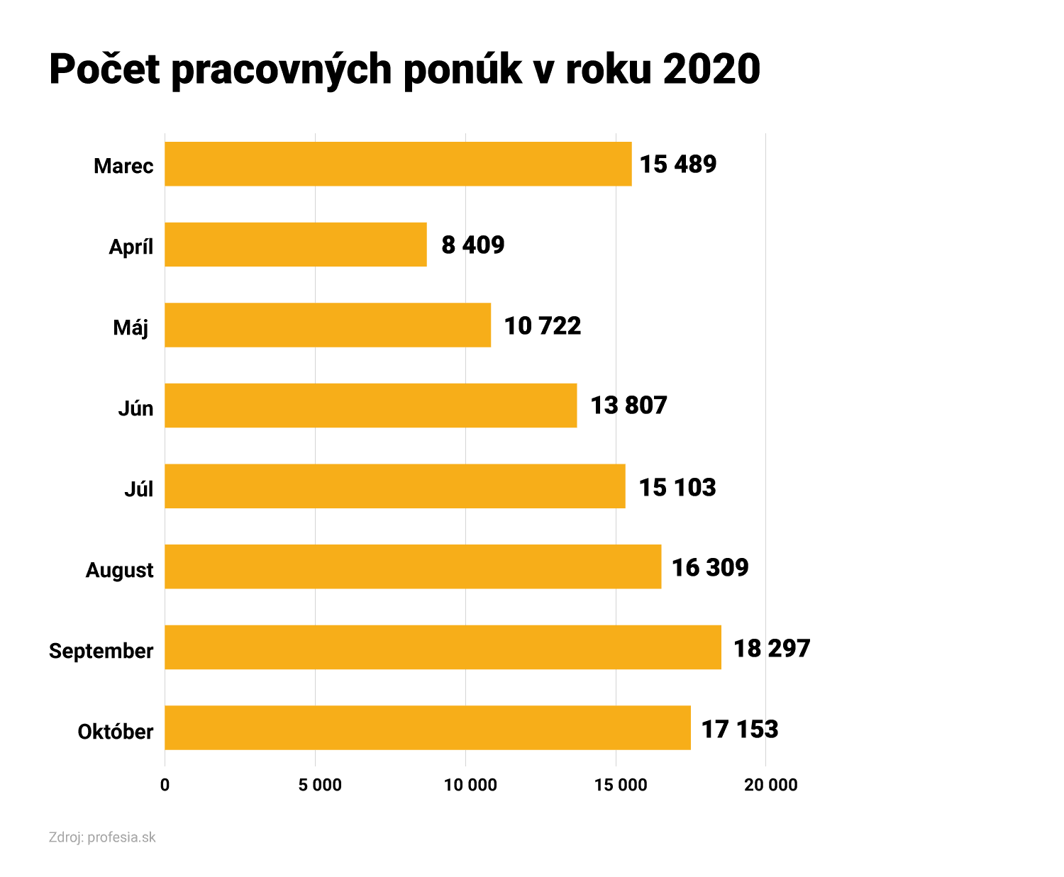 Najväčší pracovný portál Profesia.sk evidoval v októbri viac ako 17-tisíc pracovných ponúk. Napriek tomu, že aktuálne čísla pozitívnych prípadov Covid-19 sú vyššie než počas prvej vlny, na počte pracovných ponúk sa to prejavuje menej.