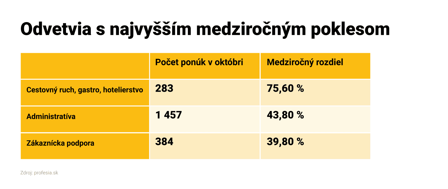 Medzi odvetviami s najvyšším medziročným prepadom sú tiež administratíva a zákaznícka podpora.