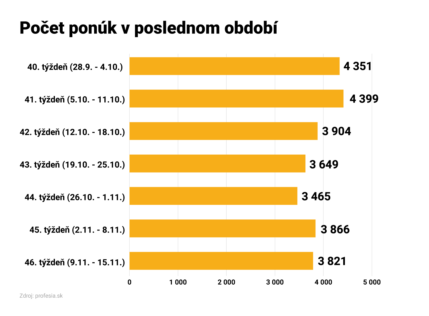 V 46. kalendárnom týždni evidovala Profesia vyše 3800 pracovných ponúk. Množstvo príležitostí sa za posledné obdobie výrazne nemení. Za posledné obdobie bol počet najnižší v 44. týždni. Práve vtedy nariadila vláda na Slovensku zákaz vychádzania.