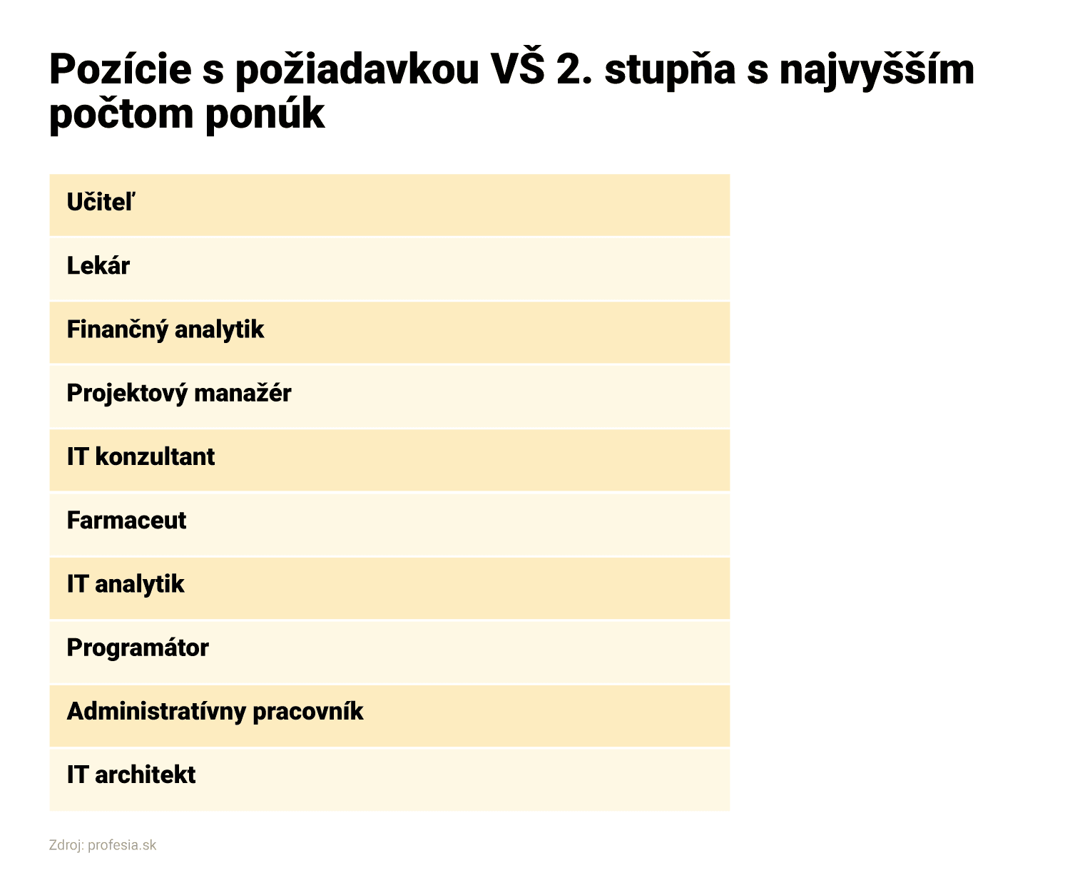 Problémom najčastejších ponúk, ktoré vyžadujú vysokú školu, je však často nižší záujem uchádzačov. Nie každý totiž spĺňa požiadavky. Aj z tohto dôvodu vidíme, že medzi záujmami firiem a záujmami ľudí sú veľké rozdiely. Spomedzi ponúk, čo požadujú vysokoškolské vzdelanie 2. stupňa, reagujú ľudia najčastejšie na pozície prevádzkových manažérov, PR manažérov alebo personalistov.