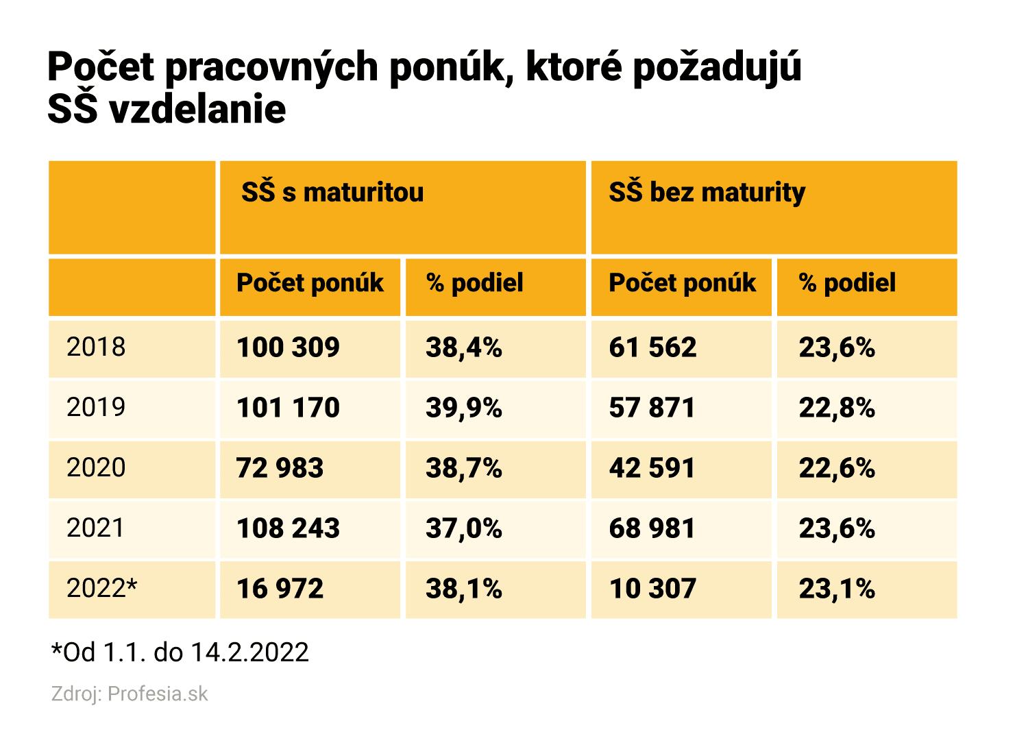 V roku 2022 je maturita požadovaná vo viac ako 38 percentách ponúk. Za ňou nasleduje stredoškolské vzdelanie bez maturity, ktoré je podmienkou v zhruba 23 percentách pracovných inzerátoch v tomto roku.