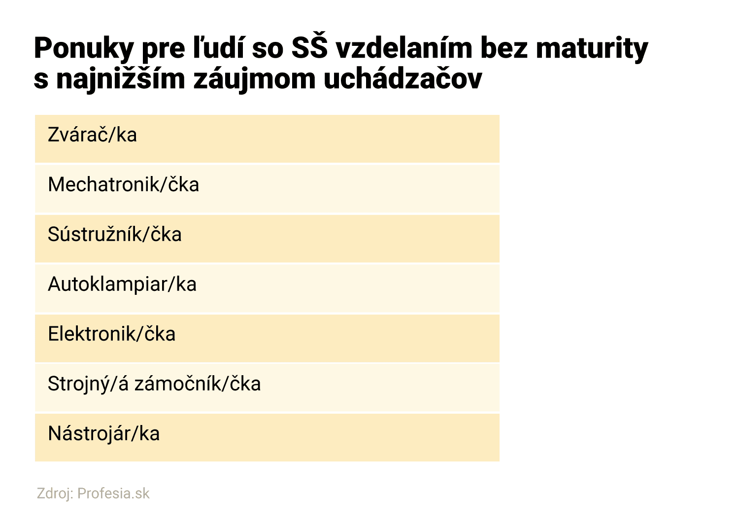 Spomedzi konkrétnych pozícií robí zamestnávateľom najväčší problém hľadanie zamestnancov na ponuky ako zvárač/ka, mechatronik/čka či sústružník/čka. V prípade týchto pozícií rátajú firmy uchádzačov na prstoch jednej ruky. Na jeden inzerát zareagujú zhruba traja až štyria uchádzači.