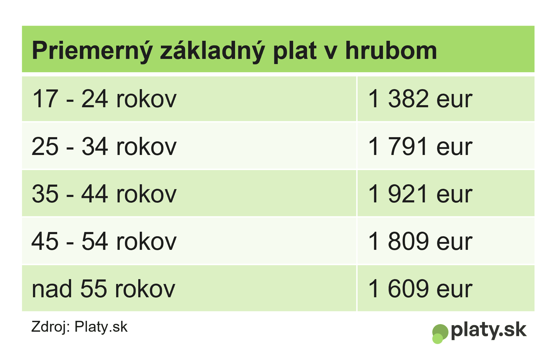 Z dát portálu Platy.sk vyplýva, že spomedzi vekových skupín zarábajú tento rok najviac pracujúci, ktorí majú 35 až 44 rokov. Ich priemerný mesačný základný plat v hrubom predstavuje 1 921 eur. Nasledujúca veková skupina zarába v priemere o 100 eur menej.