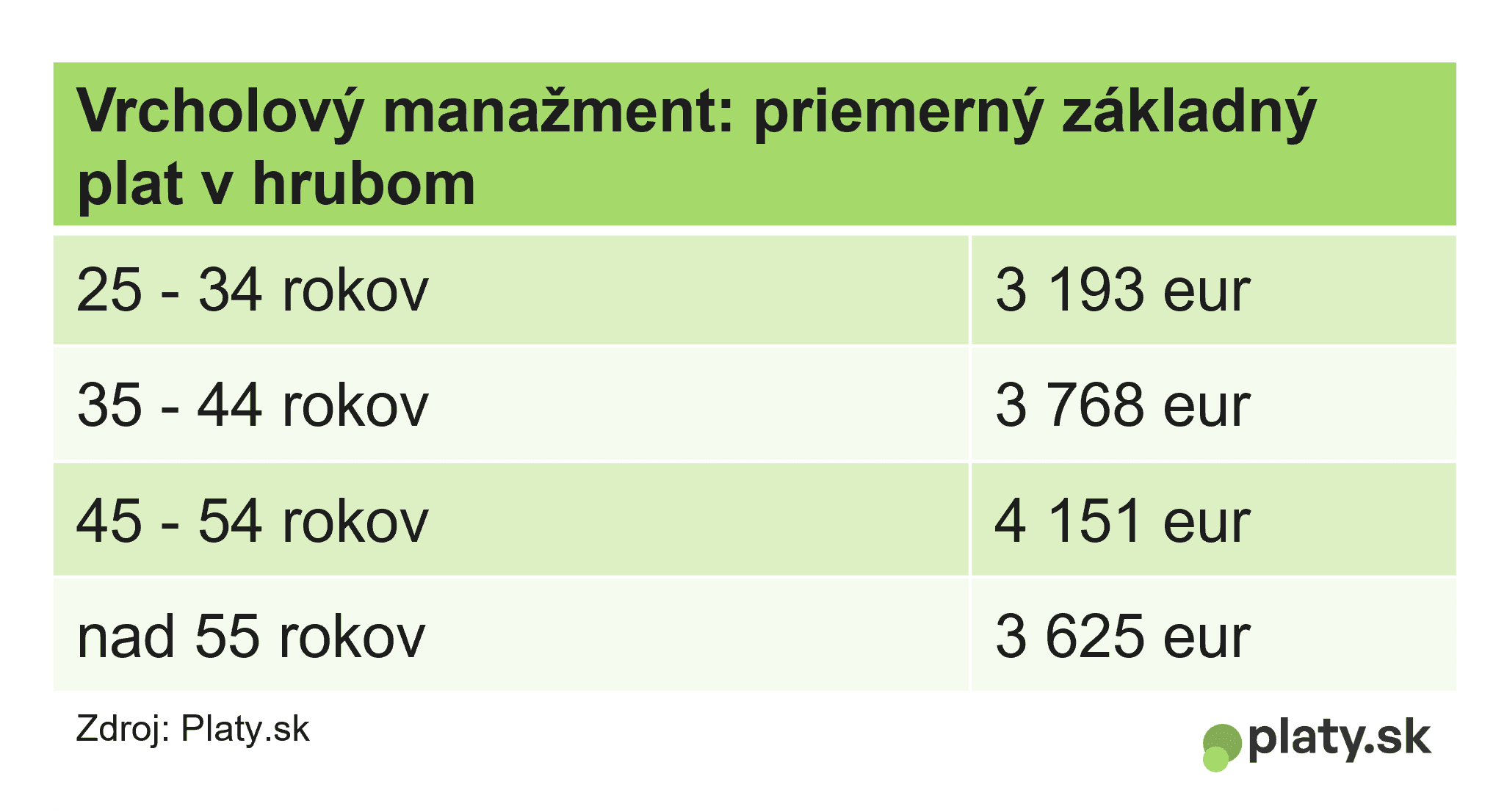 Rast platu často súvisí s postupom na vedúce pozície. Najvyššie platy majú na Slovensku vrcholoví manažéri a manažérky. Priemerný základný mesačný plat pracujúcich od 35 do 44 rokov vo vrcholovom manažmente je necelých 3 800 eur, tí od 45 do 54 rokov majú v priemere 4 150 eur. Zárobok starších vrcholových manažérov a manažérok je už o 500 eur nižší.