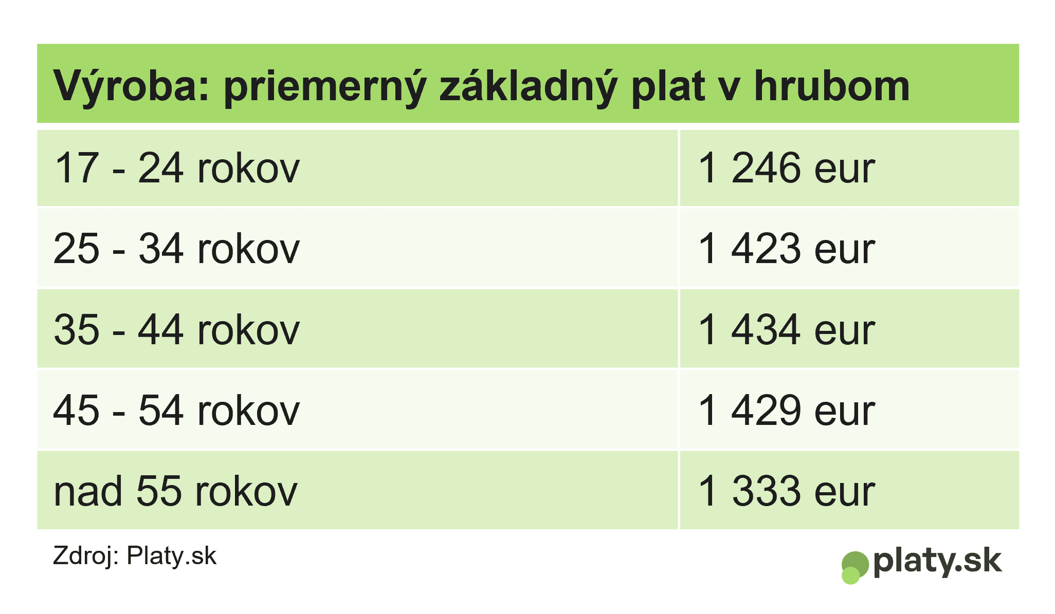 Zaujímavé rozdiely vidno medzi odvetviami. Zatiaľ čo tento trend platí v prípade ekonomiky či obchodu a zamestnanci a zamestnankyne starší ako 45 rokov majú nižší plat, IT sektor a výroba evidujú zmeny neskôr. Na pozíciách vo výrobe sa priemerný základný mesačný plat dostáva u skupiny od 25 do 34 rokov na 1 420 eur a na takmer rovnakej úrovni je aktuálne aj u kolegýň a kolegov, ktorí majú aj o 20 rokov viac. Nižší príjem portál Platy.sk eviduje u ľudí po 55-ke.