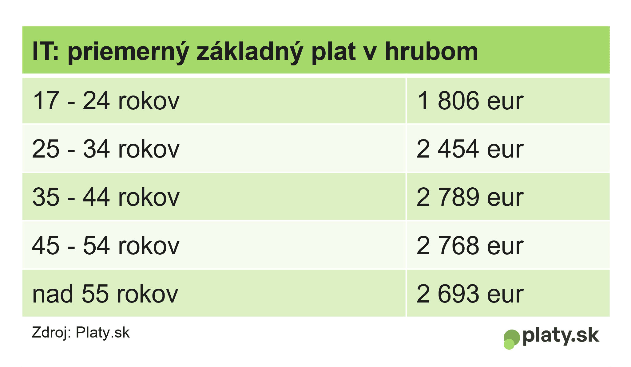 Zatiaľ čo vo výrobe je plat medzi vekovými skupinami dlho porovnateľný, v IT sektore s vekom rastie. Priemerný plat pracujúcich v tejto oblasti vo veku od 25 do 34 rokov je 2 450 eur, nasledujúce dve vekové skupiny majú v priemere o 340 eur viac – takmer 2 800 eur. Pracujúci od 35 do 54 rokov sú hodnotení takmer rovnako. Nižšie finančné ohodnotenie portál eviduje až u starších, zamestnanci v informačných technológiách, ktorí majú viac ako 55 rokov, zarábajú v priemere 2 700 eur mesačne. Z percentuálneho hľadiska je to v porovnaní s celkovým priemerom aj výrobou menší rozdiel.