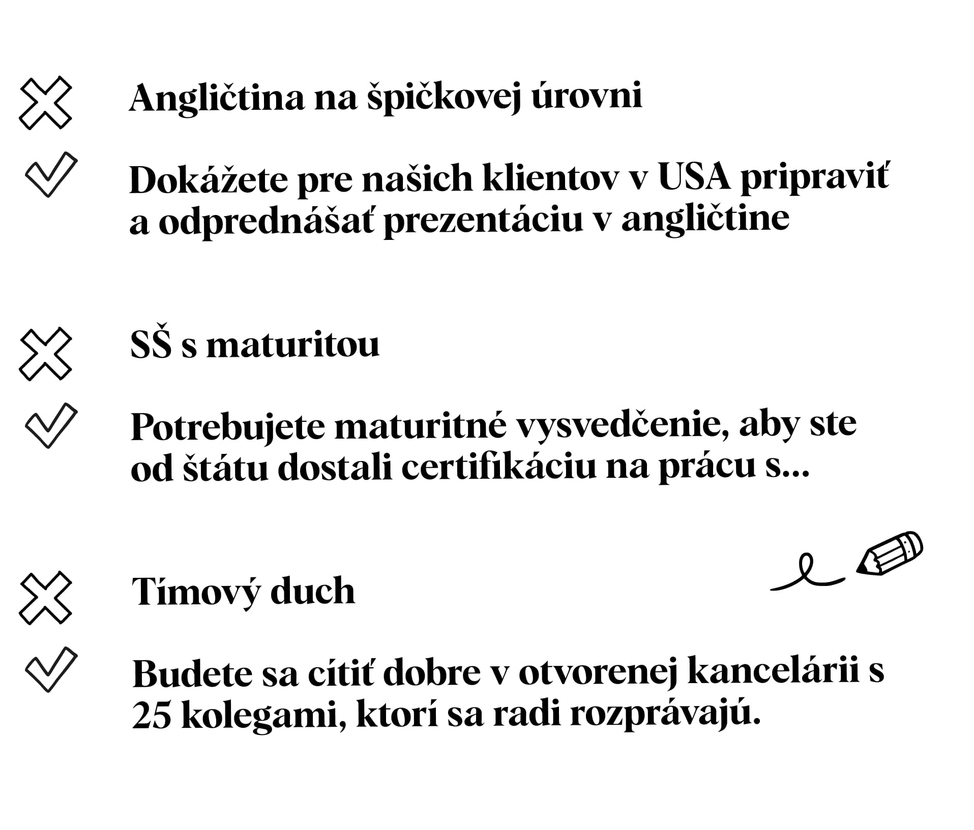 Uviesť, prečo danú zručnosť potrebujete, je výborná pomôcka aj pre vás, aby ste si uvedomili, či je naozaj dôležitá. Existujú desiatky inzerátov, ktoré uvádzajú ako požiadavku angličtinu, aj keď na danej pozícii cudzí jazyk nepoužijete ani raz za celý rok. S jasným popisom navyše kandidát porozumie požiadavke oveľa lepšie.