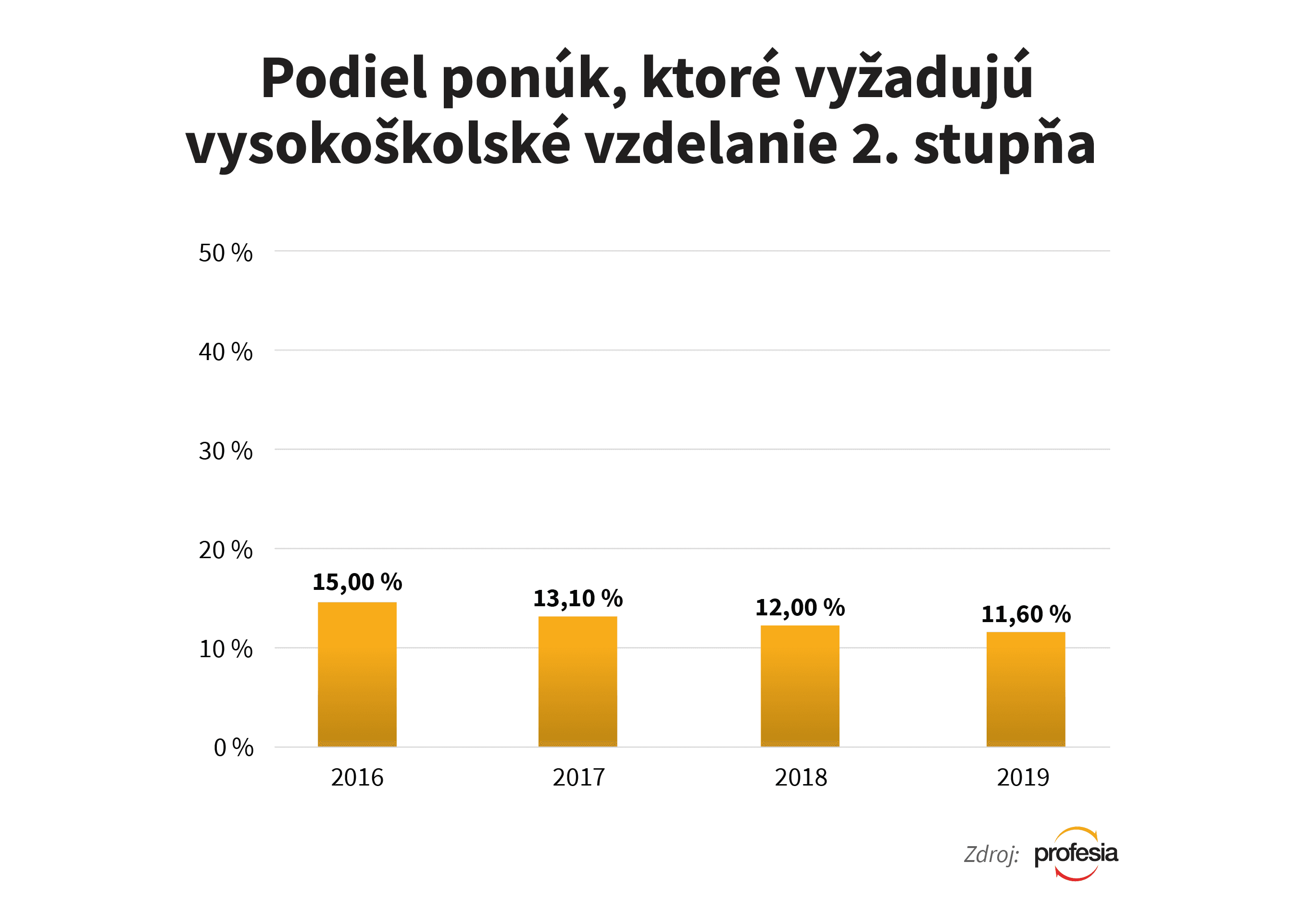 Skutočnosť, že zamestnávatelia majú v posledných mesiacoch, či rokoch väčšie problémy s hľadaním novej pracovnej sily spôsobila, že môžeme pozorovať znižovanie ich nárokov. Možno to vidieť napríklad pri vyžadovaní vysokoškolského vzdelania 2. stupňa. Kým v roku 2016 požadovalo magisterský, či inžiniersky titul 15 percent pracovných inzerátoch na Profesia.sk, v súčasnosti je to necelých 12 percent.