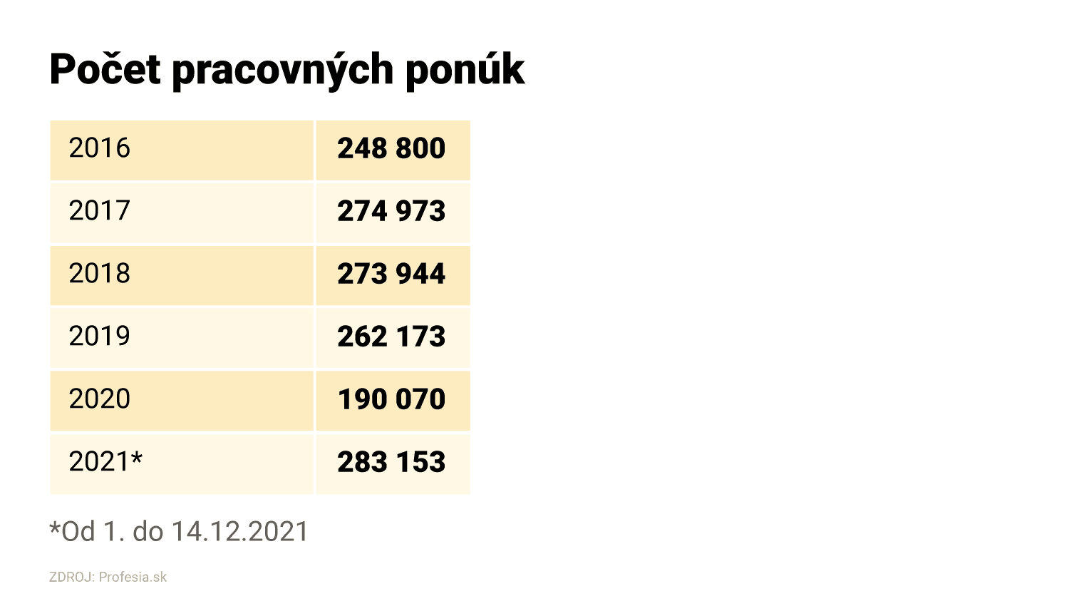 Treba zdôrazniť, že napriek obavám uchádzačom platí, že slovenský trh práce ešte nezažil taký vysoký počet ponúk, ako vidíme v súčasnosti. Doteraz najviac pracovných ponúk uverejnili firmy v roku 2017. Portál Profesia.sk evidoval v tomto období takmer 275-tisíc inzerátov. Toto číslo sa v aktuálnom roku podarilo prelomiť už za 11 mesiacov.