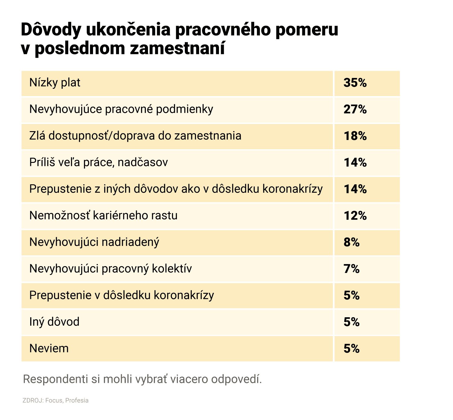 Viac ako desatina oslovených tiež uviedla, že v predošlej práci sa nedokázali vysporiadať s príliš veľkým množstvom pracovných povinností a nadčasov, zlou dostupnosťou, nemožnosti kariérneho rastu či nevyhovujúcim nadriadeným.