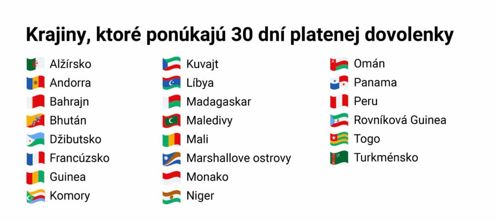 Úžasných 30 dní platenej dovolenky ročne poskytuje 22 krajín na svete, pričom 10 z nich sa nachádza v Afrike. Okrem Francúzska a Andorry si zamestnanci môžu vybrať takto dlhú platenú dovolenku ešte v týchto štátoch: