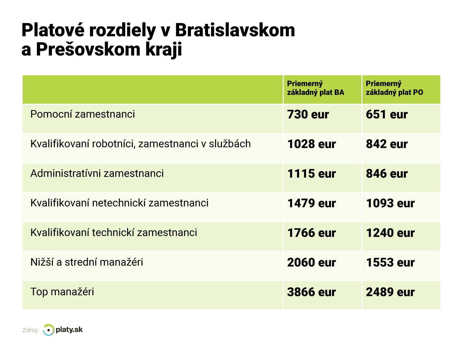 Regionálne platové rozdiely sú pri kvalifikovaných zamestnancoch ešte vyššie. Kvalifikovaní netechnickí zamestnanci majú v Prešovskom kraji priemerný základný plat 1093 eur v hrubom. Takýto pracovníci zarobia v Bratislavskom kraji o 386 eur viac. To predstavuje viac ako 35 percent.