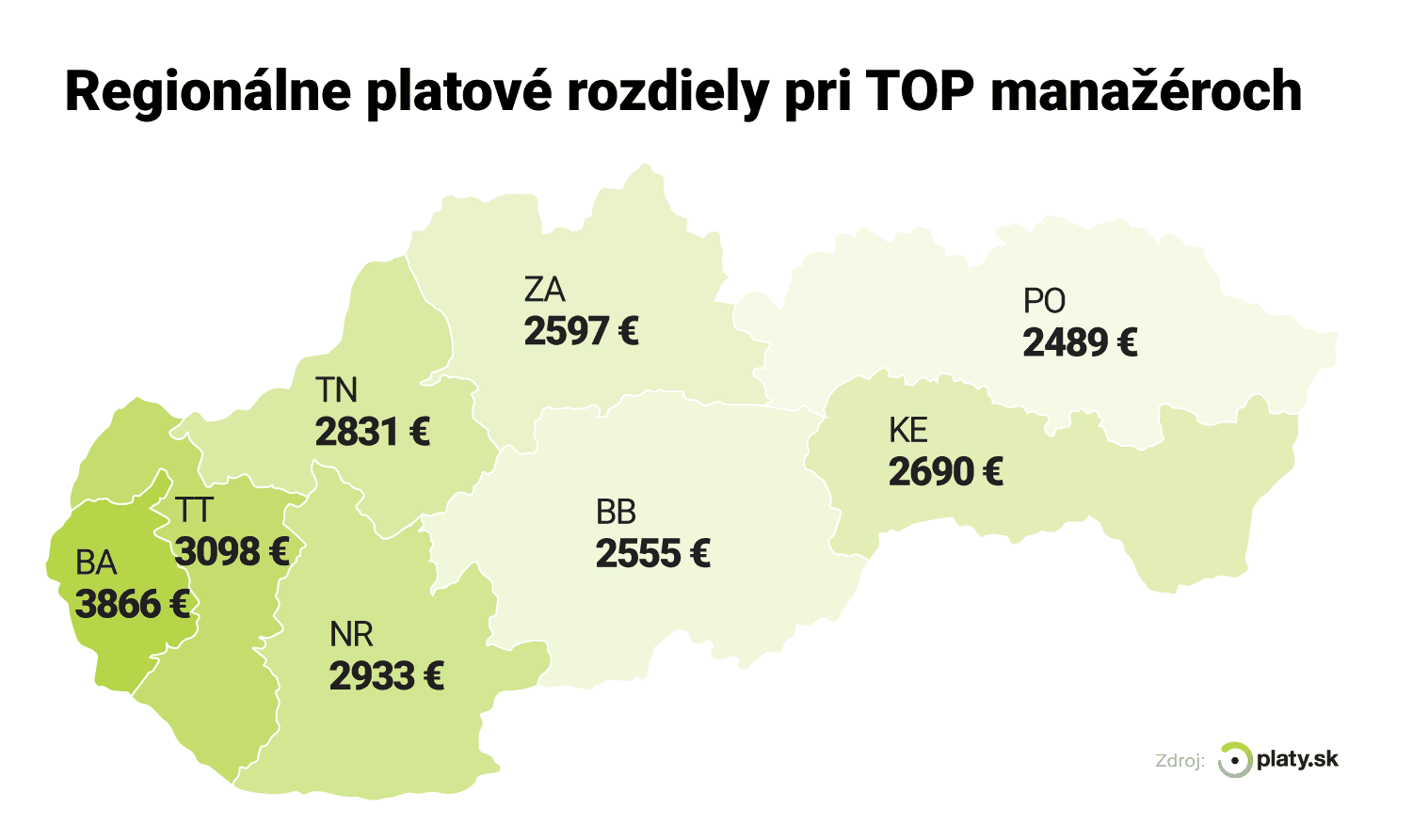 Aj pri tejto skupine zamestnancov vidíme najväčší rozdiel medzi hlavným mestom a prešovským regiónom. Manažéri v Prešovskom kraji zarobia v priemere 2489 eur v hrubom. Bratislavskí riadiaci zamestnanci majú až o 1377 eur viac, čo je viac ako 55 percent.