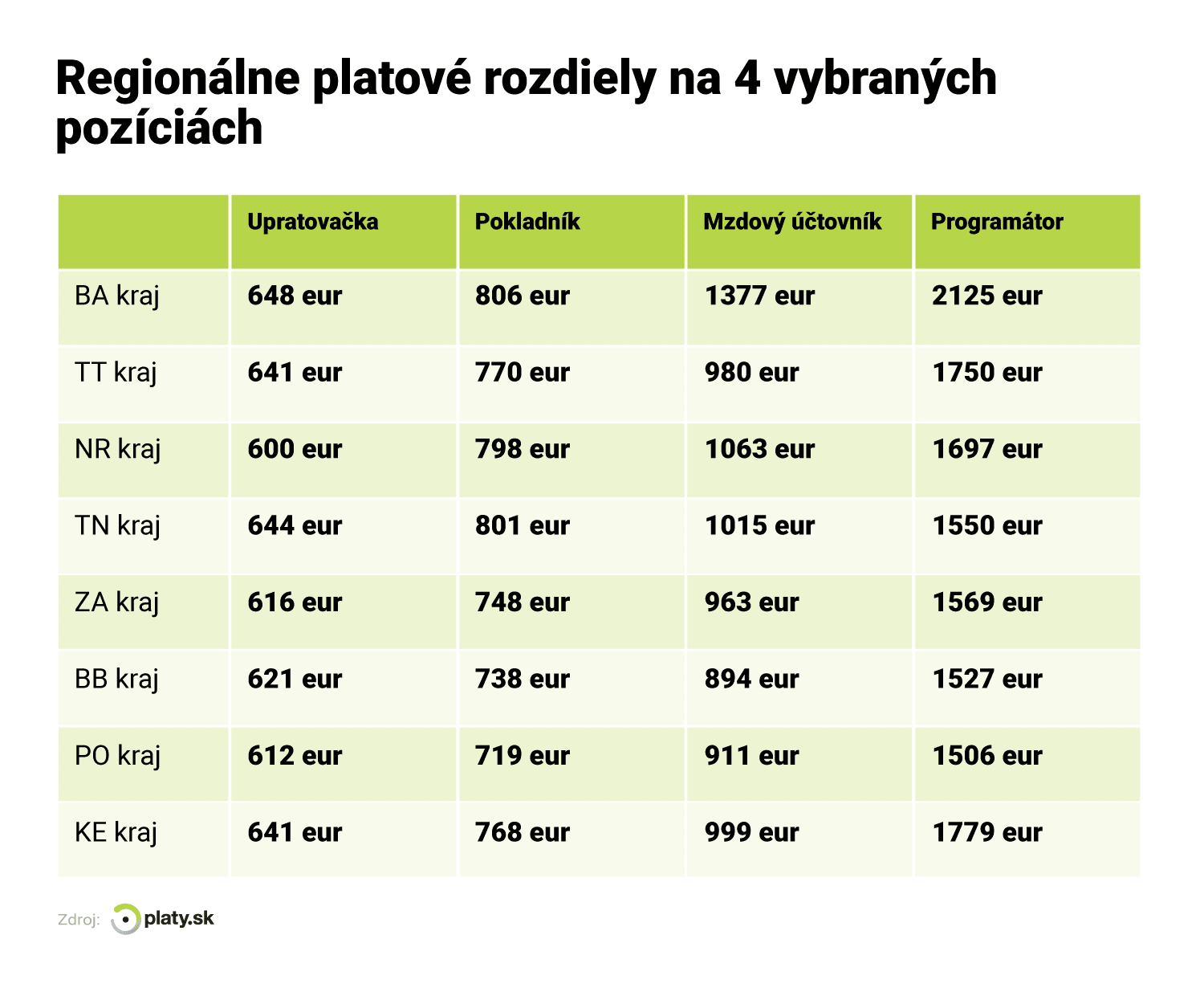 Portál Platy.sk ukazuje, ako sa vyvíjajú regionálne rozdiely na štyroch konkrétnych pozíciách. Pri upratovačkách regionálne rozdiely takmer nevidieť. Pri pokladníkoch sú síce platové pomery v jednotlivých krajoch na Slovensku rôzne, priemerné základné platy sa líšia len minimálne.