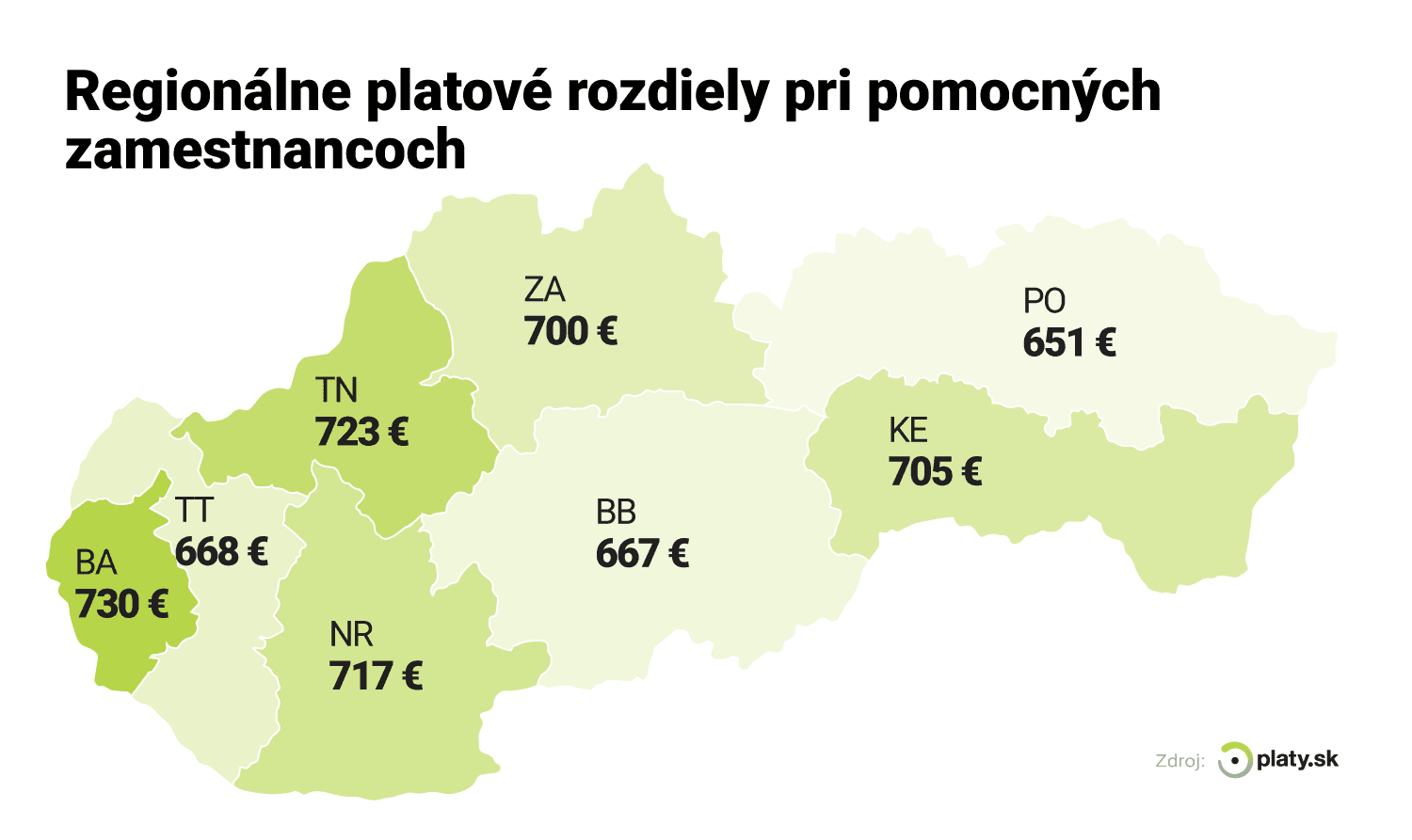 V Prešovskom kraji, kde sú mzdy na Slovensku najnižšie, predstavuje priemerný základný plat pomocných zamestnancov 651 eur v hrubom. V porovnaní s Bratislavským krajom ide o rozdiel 12 percent.