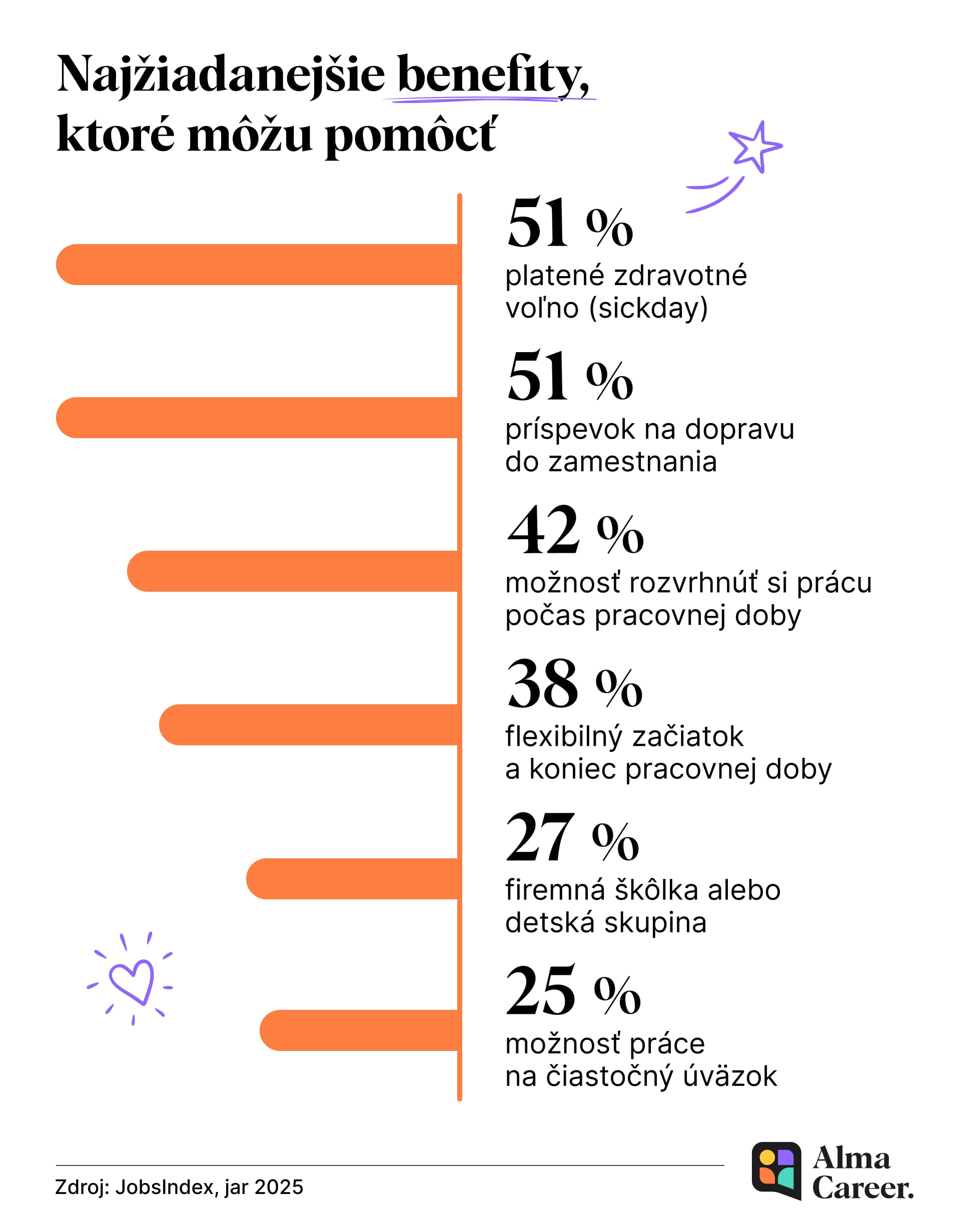 Dáta z nášho prieskumu JobsIndex ukazujú viacero zaujímavých momentov, ktoré odrážajú očakávania zamestnancov týkajúce sa benefitov. Práve to sú tie prázdne miesta, ktoré môžu firmy zaplniť a uľahčiť tak aj životy jednorodičom.