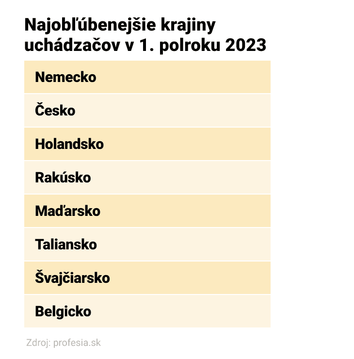 Tento rok Slováci a Slovenky najčastejšie reagujú na ponuky práce do Nemecka. V prvom polroku bolo na Profesia.sk zverejnených viac ako 1800 ponúk ísť pracovať do tejto krajiny, spolu na ne prišlo viac ako 30-tisíc reakcií, a s veľkým náskokom kraľuje tomuto rebríčku. Druhou najlákavejšou krajinou je Česko, na takmer 1800 ponúk práce od našich susedov prišlo vyše 18-tisíc reakcií, a treťou najatraktívnejšou krajinou je pre našich Holandsko. Inzerátov síce bolo len 510, no reakcií bolo spolu viac ako 16-tisíc.