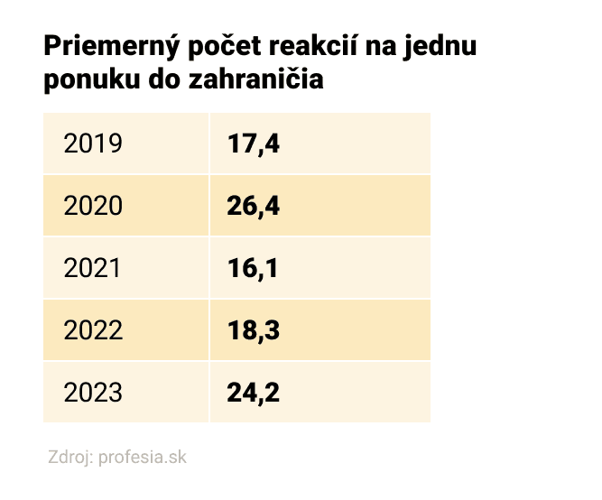 Tento rok bolo na Profesia.sk uverejnených zatiaľ 6397 ponúk práce do zahraničia. Zatiaľ čo vlani bol priemerný počet reakcií na jednu ponuku 18, tento rok reaguje na jeden takýto inzerát v priemere 24 ľudí. Viac ich bolo iba v roku 2020, vtedy však bolo z dôvodu pandémie výrazne menej ponúk.