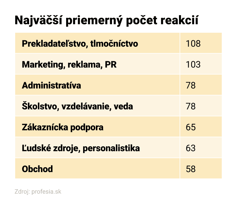 Medzi najžiadanejšie odvetvia patrí aj marketing, administratíva, zákaznícka podpora či obchod, v týchto prípadoch už na Profesia.sk evidujeme stovky ponúk. Na inzeráty z oblasti marketingu reaguje v priemere 103 ľudí, v prípade administratívy hovoríme o takmer 80 reakciách v priemere na jednu ponuku.
