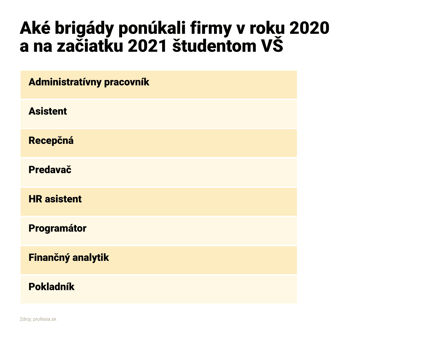 Pri brigádach, ktoré sú vhodné pre vysokoškolských študentov, môžeme vidieť viac ponúk v administratíve. Prevažujú tu ponuky na administratívnych pracovníkov, asistentov, recepčné, predavačov či HR asistentov.